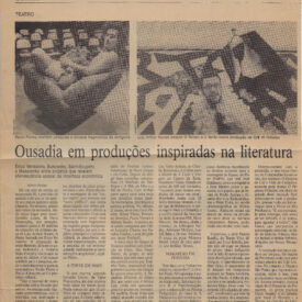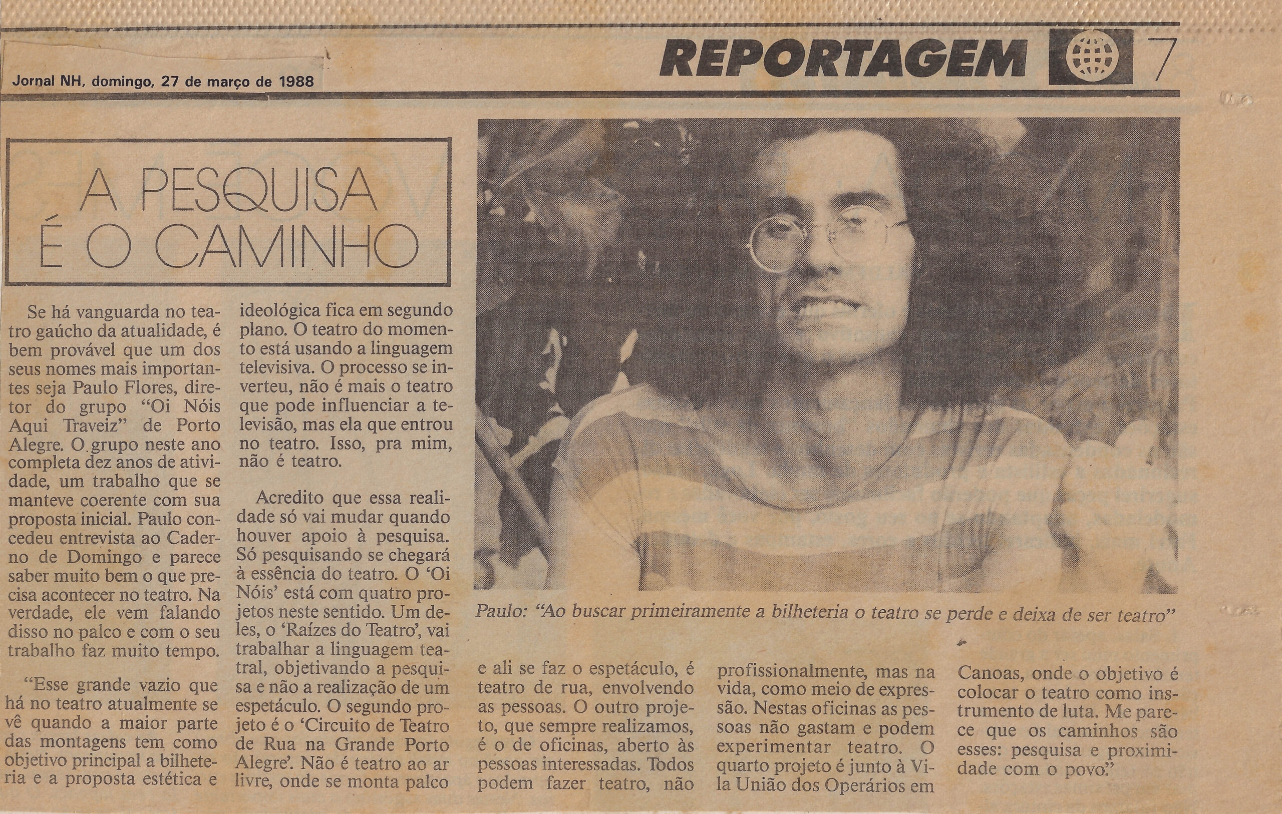 Se há vanguarda no teatro gaúcho da atualidade é bem provável que um dos seus nomes mais importantes seja Paulo Flores diretor do grupo 'Ói Nóis Aqui Traveiz' de Porto Alegre. Grupo neste ano completa dez anos de atividade um trabalho que se manteve coerente com sua proposta inicial. Paulo concedeu entrevista ao Caderno de Domingo e parece saber muito bem o que precisa acontecer no teatro. Na verdade ele vem falando disso no palco e com seu trabalho faz muito tempo. 'Esse grande vazio que há no teatro atualmente se quanto a maior parte das montagens tem como objetivo principal a bilheteria e a proposta estética e ideológica fica em segundo plano. Teatro do momento está usando linguagem televisiva. Processo se inverteu não é mais o teatro que pode influenciar a televisão mas ela que entrou no teatro. Isso pra mim não é teatro.' Acredito que essa realidade só vai mudar quando houver apoio à pesquisa. Só pesquisando se chegará à essência do teatro. O 'Ói Nóis' está com quatro projetos neste sentido. Um deles 'Raízes do Teatro' vai trabalhar a linguagem teatral objetivando a realização de um espetáculo. Entrevista extensa discutindo teatro de rua, financiamento teatral, oficinas e experimentos teatrais. Teatro como instrumento de luta. Objetivo é colocar teatro como instrumento de luta. Parecem que os caminhos são esses: pesquisa e proximidade com o povo. Foto: Paulo 'Ao buscar primeiramente a bilheteria o teatro se perde e deixa de ser teatro'.