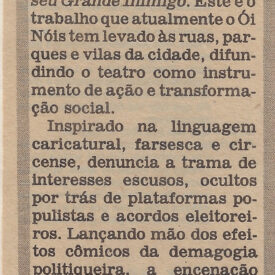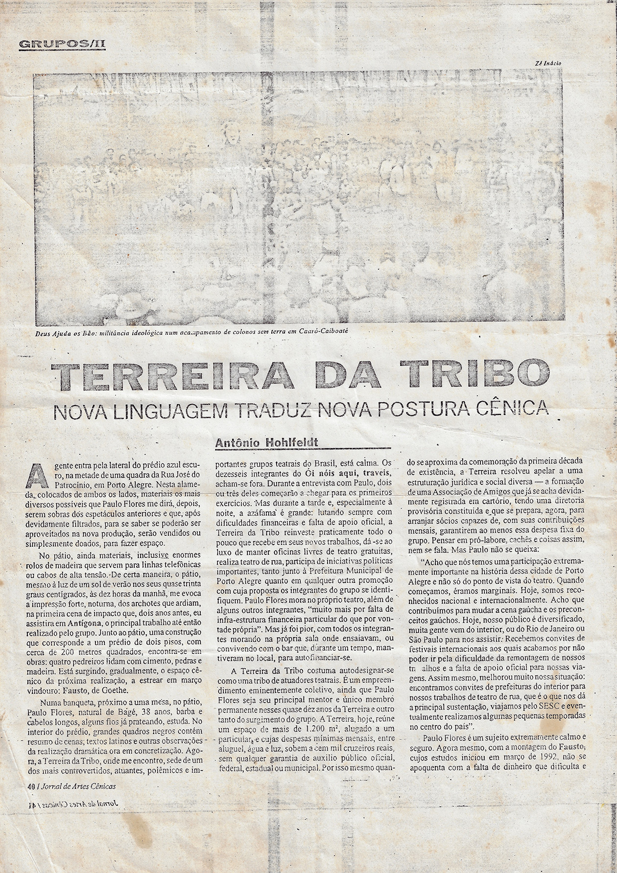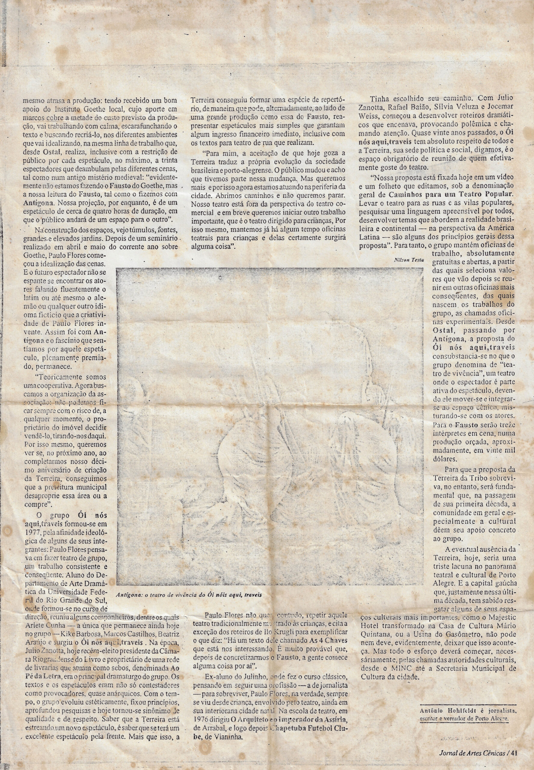 Resumo: O artigo de Antônio Hohlfeldt analisa a trajetória da Terreira da Tribo, sede do grupo gaúcho Ói Nóis Aqui Traveiz, destacando sua resistência cultural e inovação estética em Porto Alegre. Às vésperas de completar dez anos, o grupo, liderado por Paulo Flores, é descrito como uma "cooperativa" de teatro de vivência, que rompe a barreira entre ator e espectador. O texto enfatiza a transição do grupo da marginalidade para o reconhecimento nacional e internacional, mesmo mantendo uma postura política combativa e enfrentando constantes dificuldades financeiras e falta de apoio oficial. Atualmente, o grupo se dedica à ambiciosa montagem de Fausto, de Goethe, reafirmando sua pesquisa de linguagem que utiliza espaços não convencionais e dialetos inventados. Para garantir sua sobrevivência e a manutenção do espaço físico na Rua José do Patrocínio, o grupo busca se institucionalizar através de uma "Associação de Amigos" e apela por apoio governamental para evitar o fechamento da Terreira. O autor conclui que a ausência do grupo deixaria uma lacuna irreparável no panorama cultural gaúcho, sendo um patrimônio que deve ser preservado pelas autoridades e pela comunidade.