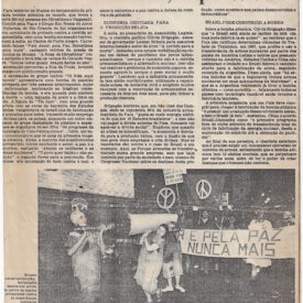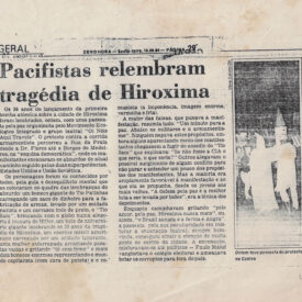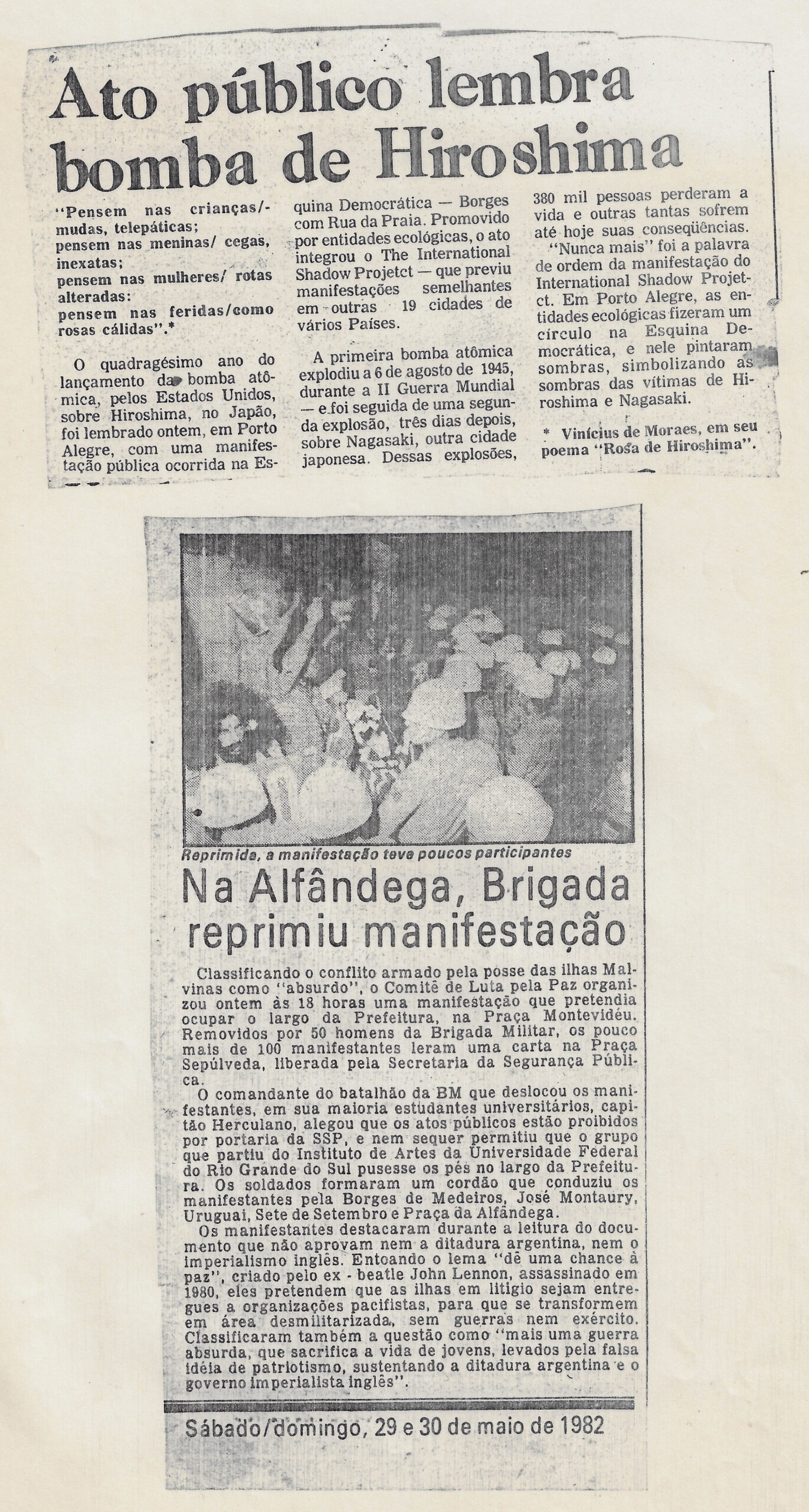 "Pensem nas crianças mudas telepáticas / pensem nas meninas/ cegas inexatas / pensem nas mulheres/ rotas alteradas / pensem nas feridas/como rosas cálidas". O quadragésimo ano do lançamento dae bomba atômica pelos Estados Unidos sobre Hiroshima no Japão foi lembrado ontem em Porto Alegre com uma manifestação pública ocorrida na Esquina Democrática Borges com Rua da Praia. Promovida por entidades sociais o ato integrou o The International Shadow Project que previu manifestações semelhantes em outras 19 cidades de vários países. A primeira bomba atômica explodiu a 6 de agosto de 1945 durante a II Guerra Mundial e foi seguida de uma segunda três dias depois sobre Nagasaki outra cidade japonesa. Dessas explosões 380 mil pessoas perderam a vida e outras tantas sofreram até hoje suas consequências. "Nunca mais" foi a palavra de ordem da manifestação do International Shadow Project. Em Porto Alegre as entidades ecológicas fizeram um círculo na mocrática Esquina Dec e nele pintaram sombras simbolizando as sombras das vítimas de Hiroxima e Nagasaki. Vinícius de Moraes em seu poema "Rosa de Hiroshima". Na Alfândega Brigada reprimiu manifestação. Classificando o conflito armado pela posse das ilhas Malvinas como "absurdo" o Comitê de Luta pela Paz organizou ontem às 18 horas uma manifestação que pretendia ocupar o largo da Prefeitura na Praça Montevideu. Removidos por 50 homens da Brigada Militar mais de 100 manifestantes leram uma carta na Praça Sepúlveda liberada pela Secretaria da Segurança Pública. O comandante do batalhão da BM que deslocou os manifestantes em sua maioria estudantes universitários capitão Herculano alegou que os atos públicos estão proibidos por portaria da SSP e nem sequer permitiu que o grupo que partiu do Instituto de Artes da Universidade Federal do Rio Grande do Sul ingressasse no largo da Prefeitura. Os soldados formaram um cordão que conduziu os manifestantes pelas Borges de Medeiros José Montaury Uruguai Sete de Setembro e Praça da Alfândega. Os manifestantes destacaram durante a leitura do documento que não apenas se opõem à ditadura argentina nem o imperialismo inglês. Entoando o lema "de uma chance a paz" criado pelo beatle John Lennon assassinado em 1980 eles pretendem que as ilhas em litígio sejam entregues e organizações pacifistas para que se transformem em área desmilitarizada sem guerras nem exército. Classificaram também a questão como "mais uma guerra absurda que sacrifica a vida de jovens levados pela falsa idéia de patriotismo sustentando a ditadura argentina e o governo imperialista inglês".