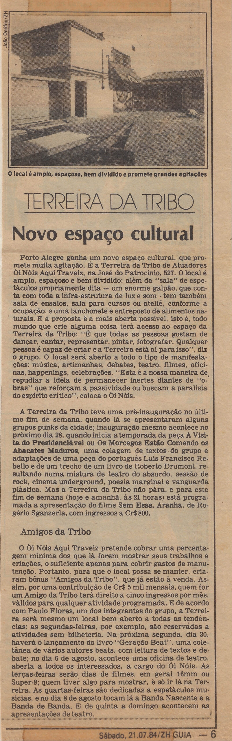 Porto Alegre ganhava um novo espaço cultural que prometia muita agitação: a Terreira da Tribo de Atuadores Ói Nóis Aqui Traveiz, localizada na Rua José do Patrocínio, 527, na Cidade Baixa. O local era amplo, espaçoso e bem dividido, contando com uma "sala" de espetáculos propriamente dita (um enorme galpão com toda a infraestrutura de luz e som), sala de ensaios, sala para cursos ou ateliê (conforme a ocupação), uma lanchonete e entreposto de alimentos naturais. A proposta era a mais aberta possível: todo mundo que criasse algo teria acesso ao espaço da Terreira da Tribo. O grupo afirmava que "todas as pessoas gostam de dançar, cantar, representar, pintar, fotografar" e que qualquer pessoa era capaz de criar, estando a Terreira ali para isso. O local seria aberto a todo tipo de manifestações: músicas, performances, debates, teatro, filmes, oficinas, happenings e celebrações, representando uma ideia de repudiar as hierarquias dos "obras primas" que reforçam a passividade ou buscam a paralisia do espírito crítico.