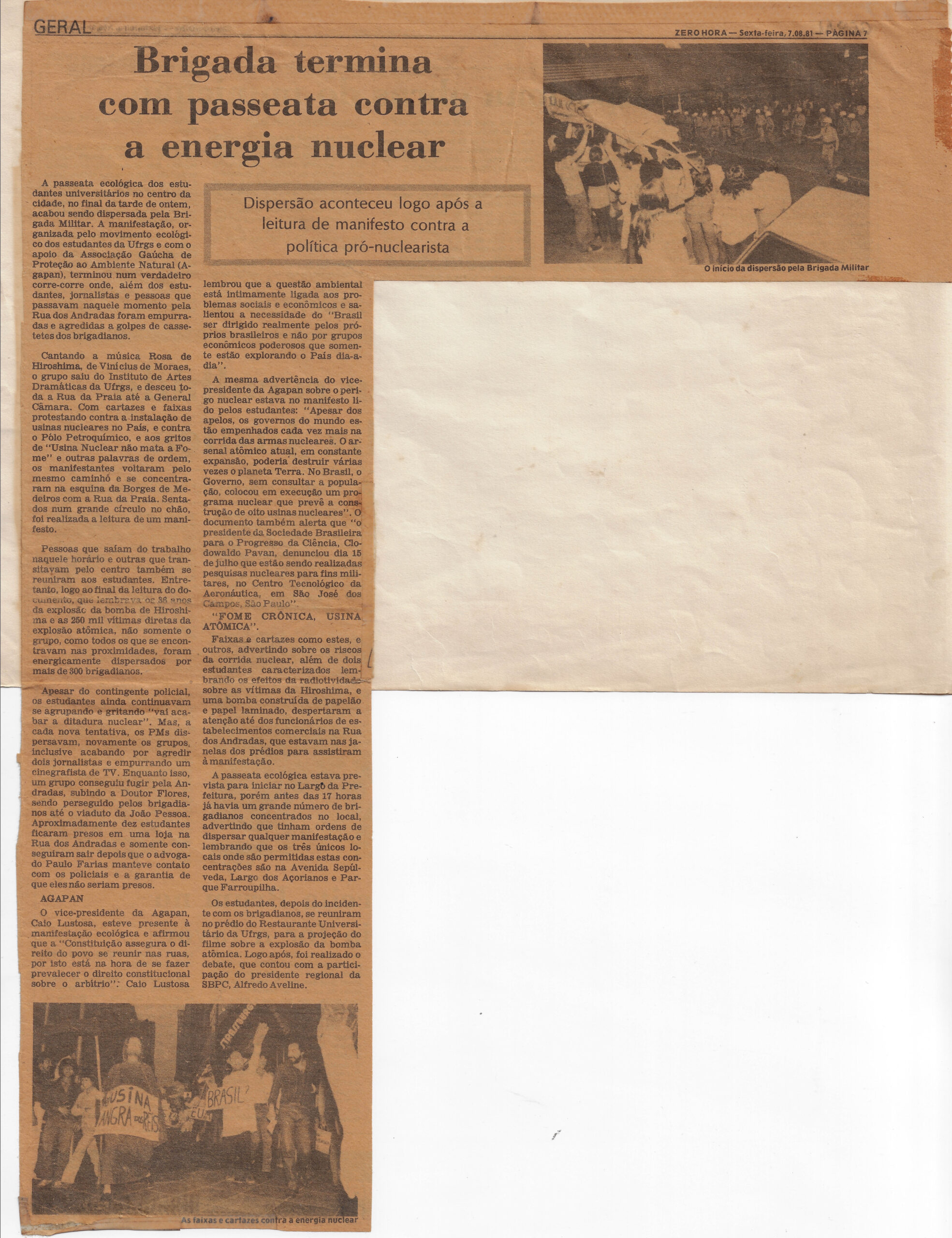 A passeata ecológica dos estudantes universitários no centro da cidade no final da tarde de ontem acabou sendo dispersada pela Brigada Militar após ser organizada pelo movimento ecológico dos estudantes da Ufrgs e com apoio da Associação Gaúcha de Proteção ao Ambiente Natural-Agapan e Amigos da Terra. A passeata ecológica aconteceu onde além dos estudantes jornalistas e pessoas que assistiam a passeata nas proximidades a Rua dos Andradas foram empurradas e agredidas e golpes de cassetete dos brigadianos. Dispersão aconteceu logo após a leitura de manifesto contra a política pró-nuclearista. Cantando a música Rosa de Hiroshima de Vinicius de Moraes o grupo saiu do Instituto de Artes Ufrgs percorrendo toda da Rua da Praia até a General Câmara. Com cartazes e faixas coloridas os manifestantes bradaram inúmeros slogans contra o Pólo Petroquímico e os gritos de "Basta de Guerrilha venha me" e outras palavras de ordem os manifestantes voltaram pelo mesmo caminho e se concentraram na esquina da Borges de Medeiros onde eles formaram um grande círculo no chão foi realizada a leitura de um manifesto. Pessoas que saíam do trabalho concentravam-se para assistir a manifestação que era cantada e elevavam pelo centro também se reuniram aos estudantes. Manifesto publicado na íntegra sobre perigo de explosão atômica usinas nucleares necessidade do Brasil ser dirigido realmente pelos produtores advertindo sobre os riscos da corrida nuclear além de dois braços os efeitos da radioatividade sobre as vítimas de Hiroshima e o papel iminado desperando su atenção até dos funcionários que trabalhavam em estabelecimentos comerciais na Rua dos Andradas que estavam nas janelas observando o ato.