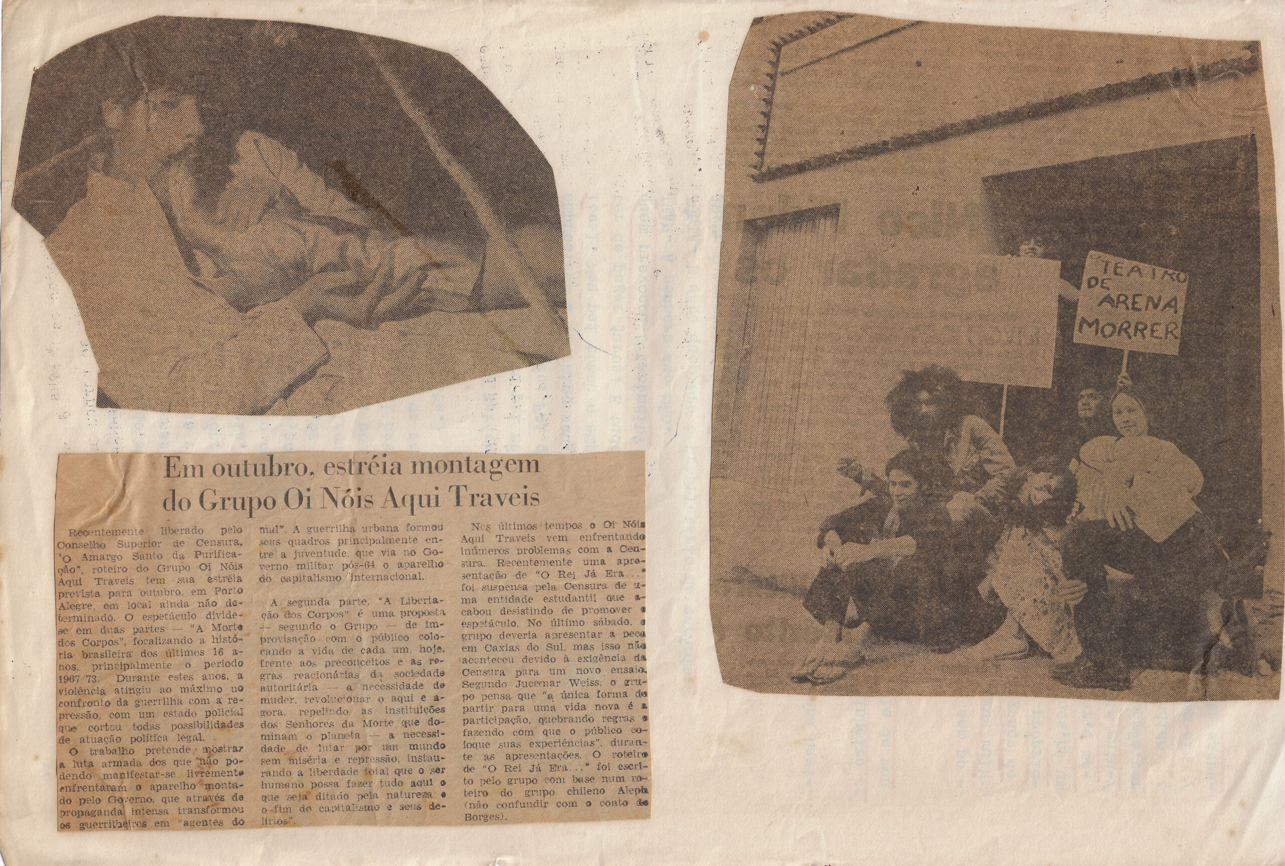 Recentemente liberado pelo Conselho Superior de Censura O Amargo Santo da Purificação de criação coletiva do grupo foi proibido pela Censura Federal depois de quase três meses de ensaios e faltando poucos dias para a estréia. A peça que utilizava textos de Sartre Alain Gainsberg e do ex-guerrilheiro Renato Tapajós para mostrar o que foi o movimento de guerrilhas no Brasil os fatos que o antecederam suas consequências e repercussões deveria estrear no Teatro de Arena mas como o teatro foi fechado por dificuldades financeiras o grupo procurava um outro local. Nesse intervalo a censura proibiu o texto sem quaisquer explicações. Nos últimos tempos o Oi Nóis Traveiz vem enfrentando inúmeros problemas com a Censura. Recentemente uma apresentação de O Rei Já Era foi censurada pela Censura da entidade estudantil que acabou desistindo de promover o espetáculo. No último sábado o grupo deveria apresentar a peça no auditório da Federação de Estudantes mas não aconteceu devido à exigência da Censura para um novo ensaio geral que aconteceu dia 29 de abril. Segunda parte A Libertação dos Corpos é uma proposta de improvisação com o público coordenado pelo grupo provocando com o público experiências e caminhos de vida de cada um hoje frente dos preconceitos e as lógicas redutoras que aprisionam. O trabalho pretende apelar para a luta armada dos que não podendo manifestar-se livremente enfrentaram o aparelho repressor montado pelo Governo que através de propaganda intensa transformou ideológico inimigo do povo. Foto com faixa TEATRO DE ARENA MORRER.