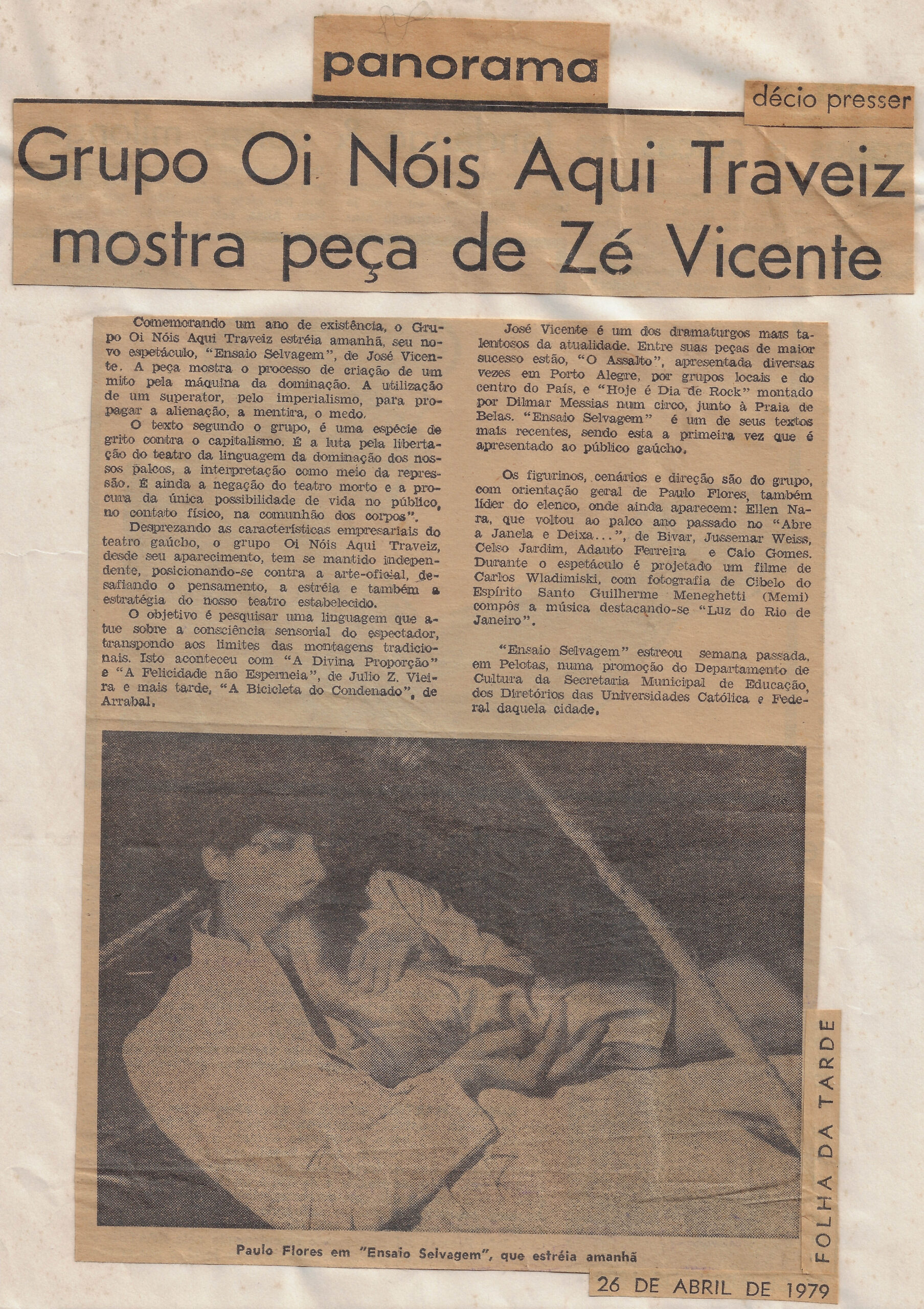 “Ensaio Selvagem” de Zé Vicente termina sua temporada domingo Voltar AD.ONAT00042 Metadados Número de RegistroAD.ONAT.00042AutoriaNão identificadoDescriçãoDocumento em processo de transcrição por problemas de legibilidadeData18/05/1979Local de ProduçãoAmérica do Sul > Brasil > Rio Grande do Sul > Porto AlegreDenominaçãoClipagemMaterialidadePapel jornalEstado de ConservaçãoBomPalavras-chaveJosé Vicente; Estreia “Ensaio Selvagem” Caminho errado, embora coerente Voltar para a lista de itens