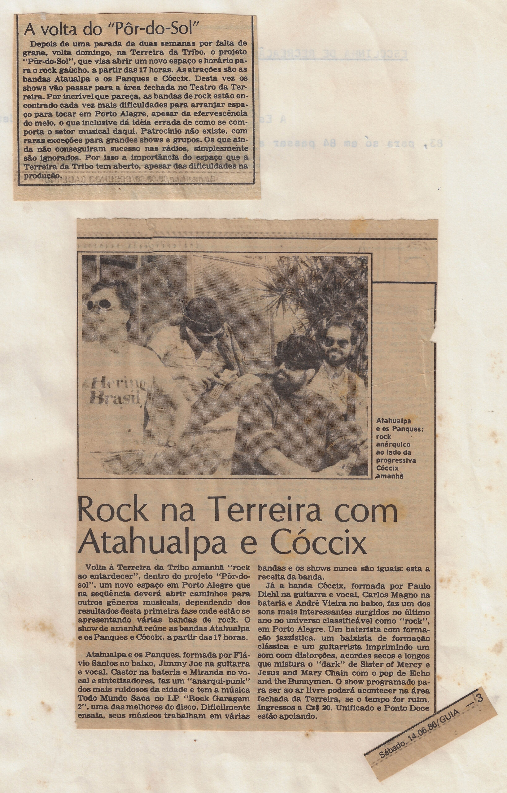 A matéria sobre o show específico explicava que a volta do "rock ao entardecer" representava um novo espaço em Porto Alegre para a existência do rock e abertura de caminhos para outros gêneros musicais, dependendo dos resultados desta primeira fase. A banda Atahualpa e os Panques era formada por Flávio Santos no baixo, Jimmy Joe na guitarra e vocal, Castor na bateria e Miranda no vocal e sintetizadores, fazendo um "anarqui-punk" dos mais ruidosos da cidade com música incluída no LP "Rock Garagem 2", uma das melhores do disco, embora dificilmente ensaiassem pois seus músicos trabalhavam em várias bandas. Já a banda Cóccix, formada por Paulo Diehl na guitarra e vocal, Carlos Antonio Pfeiffer na bateria e André Vieira no baixo, era uma das mais interessantes surgidas no último ano. Não se classificavam como "rock" em Porto Alegre, pois tinham um baterista com formação jazzística, um baixista de formação clássica e um guitarrista imprimindo um som com distorções, acordes secos e longos que misturava o "dark" de Sister of Mercy e Jesus and Mary Chain com o pop de Echo and the Bunnymen. O show programado para ser ao ar livre poderia acontecer na área fechada da Terreira se o tempo ficasse ruim, com ingressos unificados a Cr$ 20.