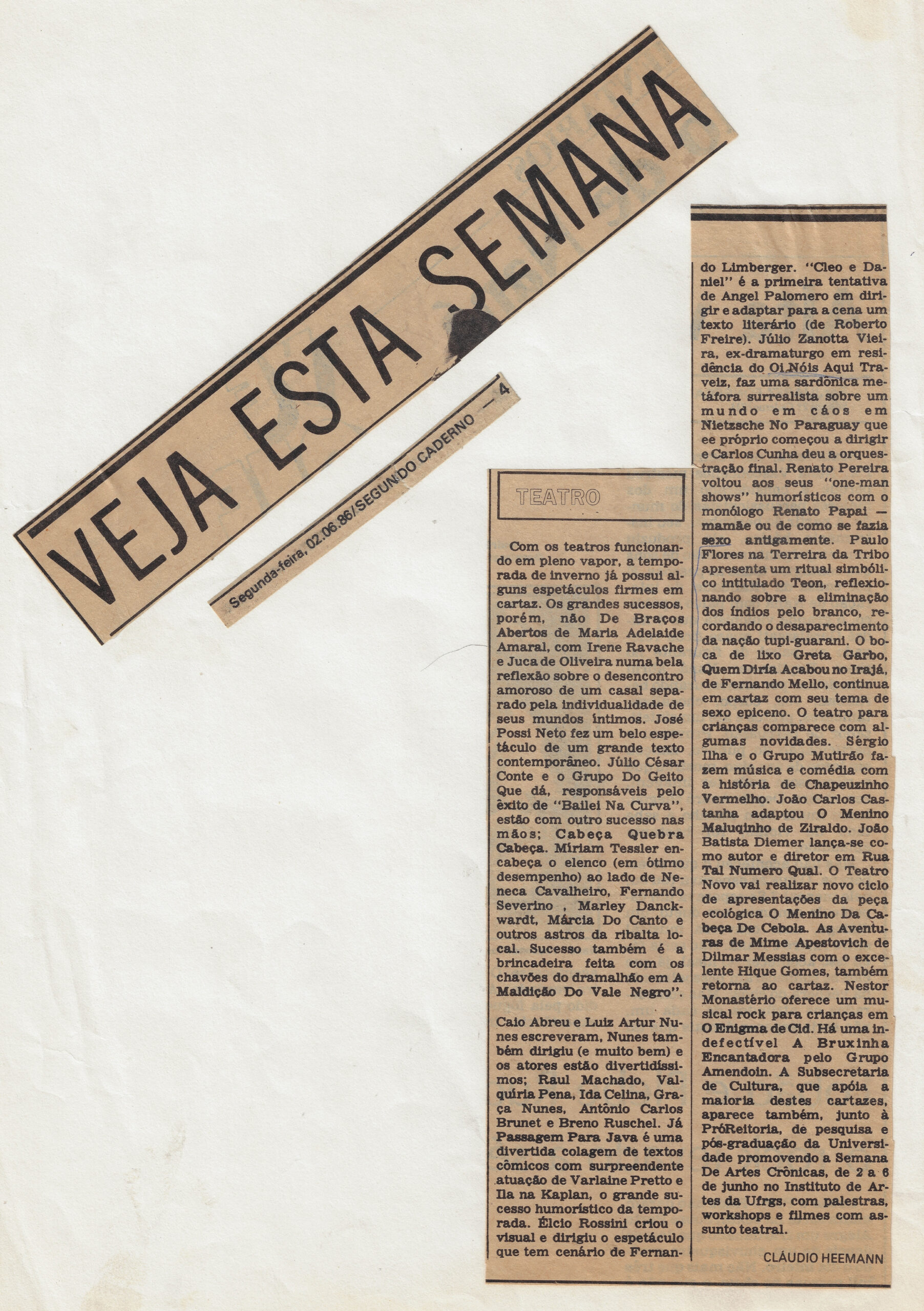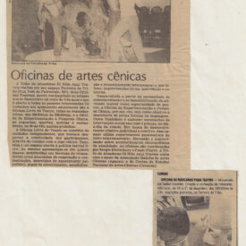 Veja esta semana Voltar AD.ONAT00258 Metadados Número de RegistroAD.ONAT.00258AutoriaNão identificadoDescriçãoSeção de Teatro com diversos espetáculos em cartaz. Menciona Paulo Flores na Terreira da Tribo apresentando um ritual simbólico intitulado Teon, refletindo sobre a eliminação dos índios pelo branco. Coluna de Claudio Heemann.Data02 de junho de 1986Local de ProduçãoAmérica do Sul > Brasil > Rio Grande do Sul > Porto AlegreDenominaçãoClipagemAtividadeCelebração > Teatro de Rua > Teon - Morte em Tupi-GuaraniMaterialidadePapelEstado de ConservaçãoBomPalavras-chaveAgenda cultural; Crítica teatral Oficinas de artes cênicas Irreverência nos palcos Voltar para a lista de itens