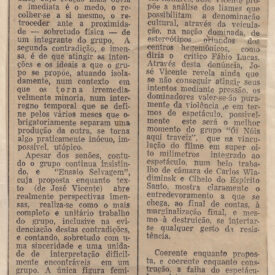 O grupo Ói Nóis Aqui Traveiz estreia "Ensaio Selvagem", criação coletiva baseada em texto de Zé Vicente. Surgido no início do ano passado com características diferentes, o grupo desprezou subsídios oficiais e buscou nova relação ator/espectador onde o teatro seja comunhão entre elenco e público. Em setembro, após contestar padrões culturais, o grupo sofreu repressão com fechamento do teatro pela polícia e prisões de membros durante apresentações de "A Divina Proporção" e "A Felicidade Não Esperneia". A nova montagem mostra a criação de um mito pela máquina da dominação através de Brown Sugar, usada como propaganda imperialista pelo empresário Mister Flashman. O diretor Lovelock realiza lavagem cerebral transformando Sugar em autômato, num ato de vampirismo que desmonta gestos, máscaras e linguagem, representando a perda de identidade de um povo devorado pelos colonizadores. O espetáculo utiliza única figura feminina Ellen Nara como Brown Sugar, Celso Jardim como figura convincente, Adauto Ferreira comandando parafernália de ruídos, Jussemar Weiss, Paulo Flores e Caio Gomes. A cenografia e ambientação integram texto de Zé Vicente aos acontecimentos atuais.