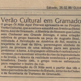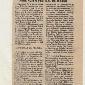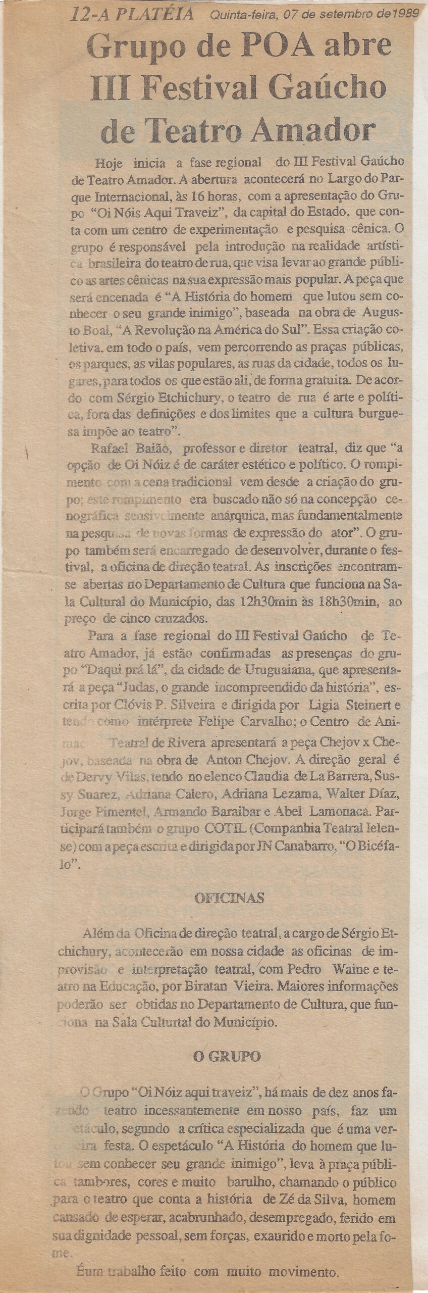 Hoje inicia a fase regional do III Festival Gaúcho de Teatro Amador a abertura acontecerá na Largos Parque Internacional às 16 horas com apresentação do Grupo 'Ói Nóis Aqui Traveiz' da capital do Estado que conta com um centro de experimentação e pesquisa cênica. Grupo é responsável pela introdução na realidade artística brasileira do teatro de rua que visa levar ao grande público as artes cênicas na expressão mais popular. Peça que será encenada é 'A História do homem que lutou sem conhecer o seu grande inimigo' baseada na obra de Augusto Boal 'A Revolução na América do Sul'. Essa criação coletiva em todo país vem percorrendo as praças públicas os parques as vilas populares as ruas da cidade todos os lugares para todos os que estilo ali de forma gratuita. De acordo com Sérgio Etchichury o teatro de rua é arte e política fora das definições e dos limites que a cultura burguesa impõe ao teatro. Rafael Baião professor e diretor teatral diz que opção de Oi Nóiz é de caráter estético e político. Rompimento com a cena tradicional vem desde a criação do grupo. Para defender esse princípio grupo com dez anos de existência rompeu com as associações de classe de Porto Alegre e com Escola Tradicional de Teatro. Oficinas de direção teatral inscrições encontram-se abertas no Departamento de Cultura que funciona na Sala Cultural do Município das 12h30min às 18h30min ao preço de cinco cruzados.