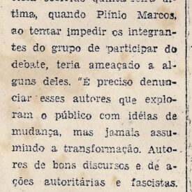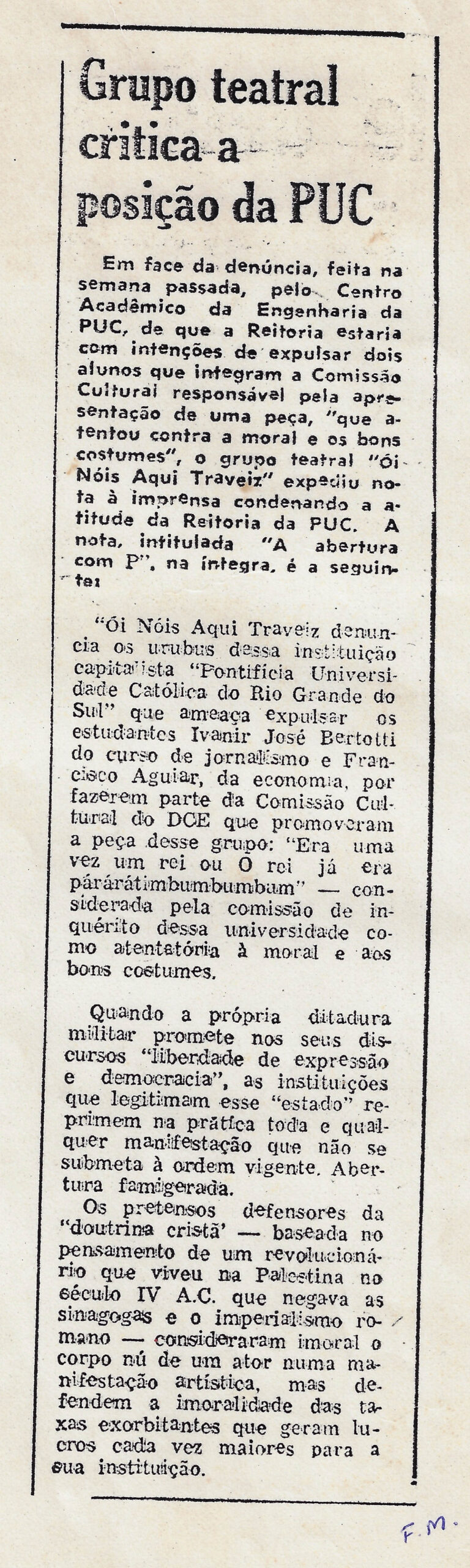 Denúncia do Centro Acadêmico da Engenharia da PUC contra Reitoria que estaria com intenções de expulsar dois alunos da Comissão Cultural responsável pela apresentação de uma peça 'que atentava contra a moral e os bons costumes'. Grupo teatral Ói Nóis Aqui Traveiz expediu nota condenando atitude da Reitoria da PUC. Nota intitulada 'A abertura com P'. Denunciam truques dessa instituição capitalista 'Pontifícia Universidade Católica do Rio Grande do Sul' que ameaça expulsar estudantes por fazerem parte da Comissão Cultural do DCE.