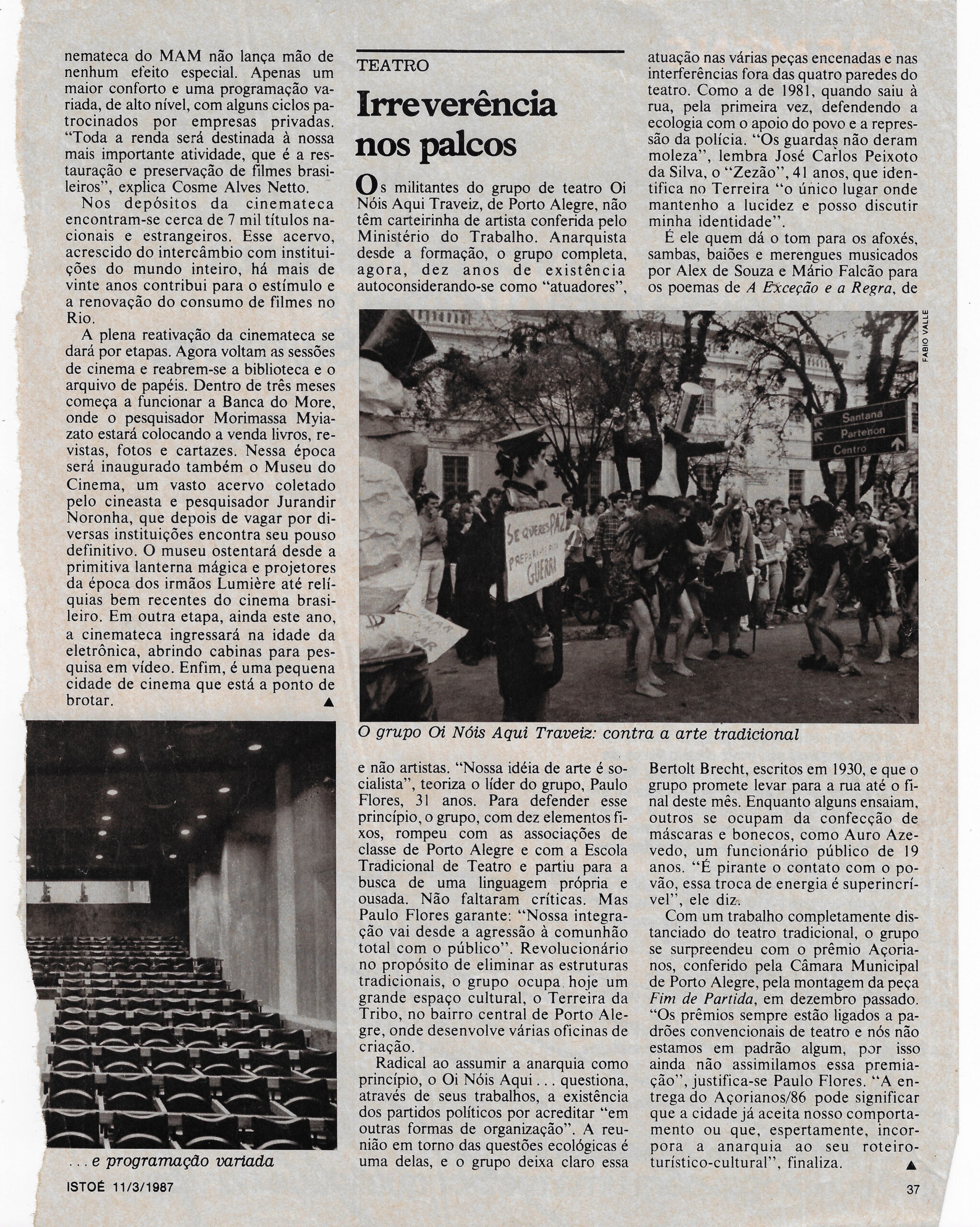 Os militantes do grupo de teatro Oi Nóis Aqui Traveiz, de Porto Alegre, não têm carteirinha de artista conferida pelo Ministério do Trabalho. Anarquista desde a formação, o grupo completa, agora, dez anos de existência autoconsiderando-se como "atuadores". Paulo Flores garante: "Nossa integração vai desde a agressão à comunhão total com o público". O grupo ocupa hoje um grande espaço cultural, o Terreira da Tribo, no bairro central de Porto Alegre.