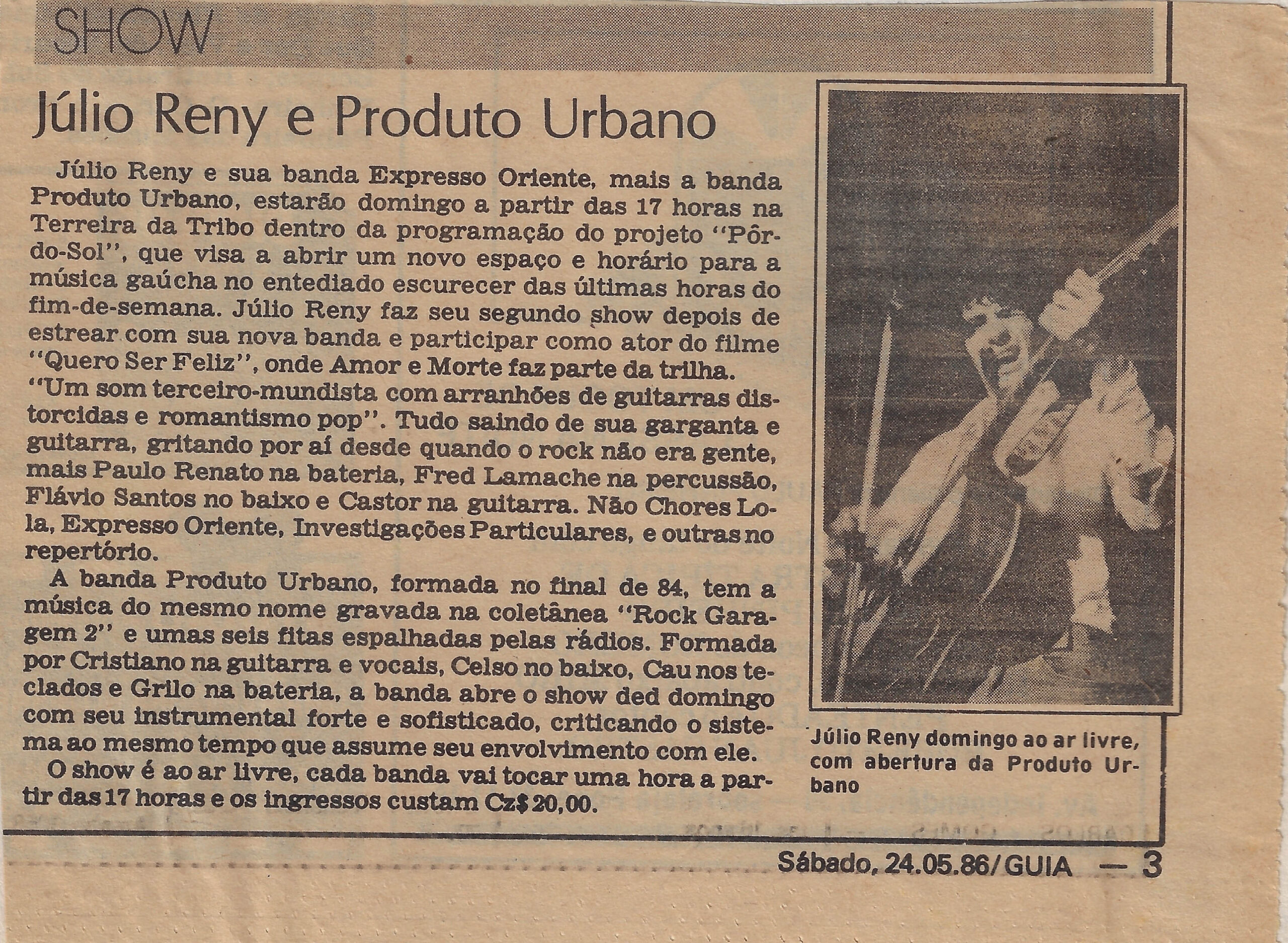 Júlio Reny e sua banda Expresso Oriente, mais a banda Produto Urbano, estarão domingo a partir das 17 horas na Terreira da Tribo dentro da programação do projeto "Pôr-do-Sol", que visa a abrir um novo espaço e horário para a música gaúcha no entediado escurecer das últimas horas do fim-de-semana. Júlio Reny faz seu segundo show depois de estrear com sua nova banda e participar como ator do filme "Quero Ser Feliz", onde Amor e Morte faz parte da trilha. "Um som terceiro-mundista com arranhões de guitarras distorcidas e romantismo pop". Tudo saindo de sua garganta e guitarra, gritando por aí desde quando o rock não era gente, mais Paulo Renato na bateria, Fred Lemache na percussão, Flávio Santos no baixo e Castor na guitarra. Não Chores Lola, Expresso Oriente, Investigações Particulares, e outras no repertório. A banda Produto Urbano, formada no final de 84, tem a música do mesmo nome gravada na coletânea "Rock Garagem 2" e umas seis fitas espalhadas pelas rádios. Formada por Cristiano na guitarra e vocais, Celso no baixo, Cau nos teclados e Grilo na bateria, a banda abre o show ded domingo com seu instrumental forte e sofisticado, criticando o sistema ao mesmo tempo que assume seu envolvimento com ele. O show é ao ar livre, cada banda vai tocar uma hora a partir das 17 horas e os ingressos custam Cr$ 20,00.