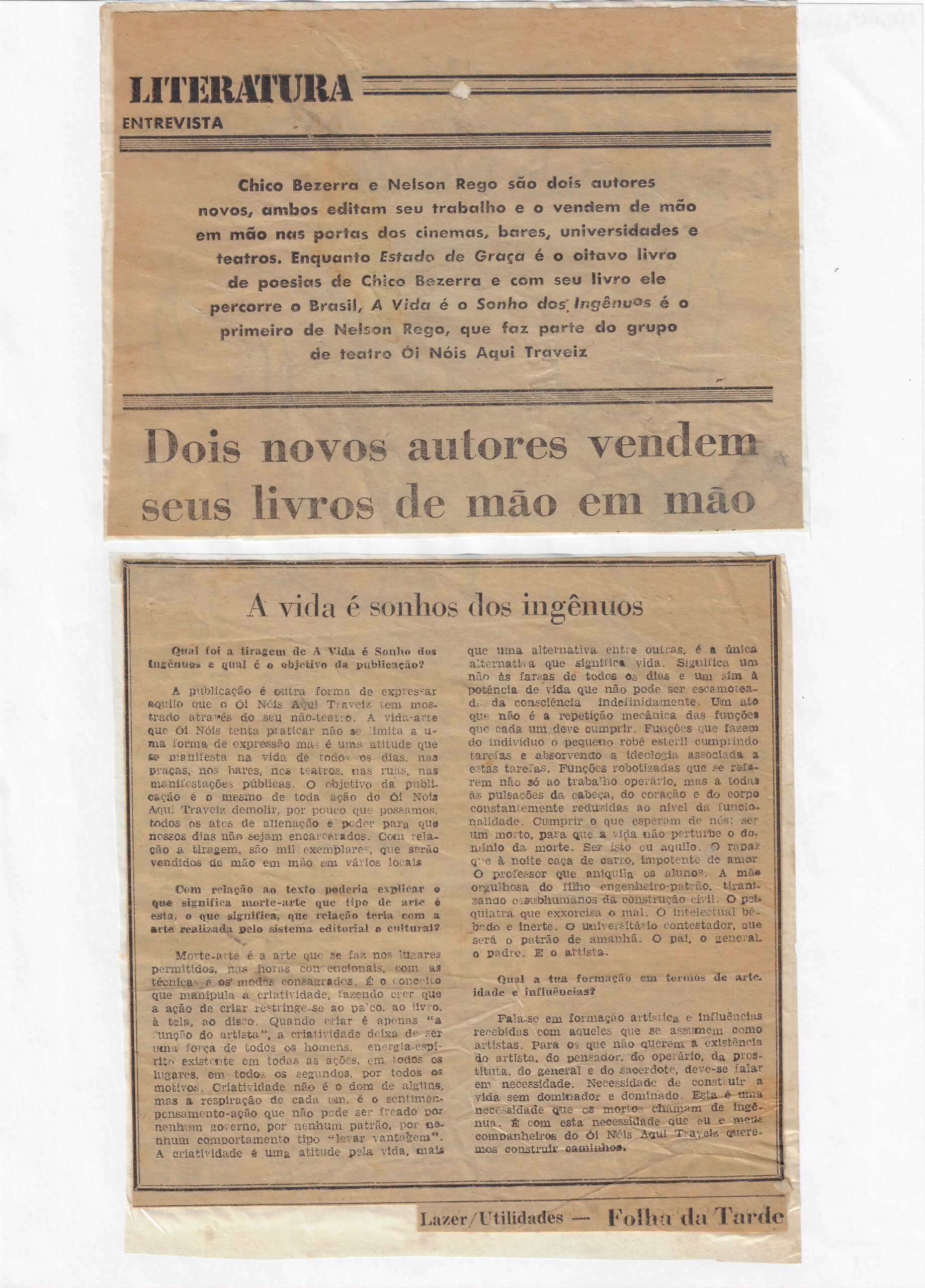 • LITERATURA / ENTREVISTA / Dois novos autores vendem seus livros de mão em mão / Chico Bezerra e Nelson Rego / A vida é sonhos dos ingênuos