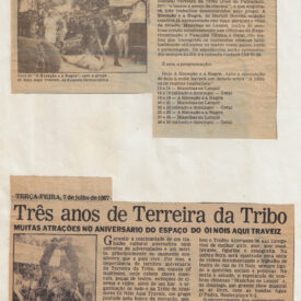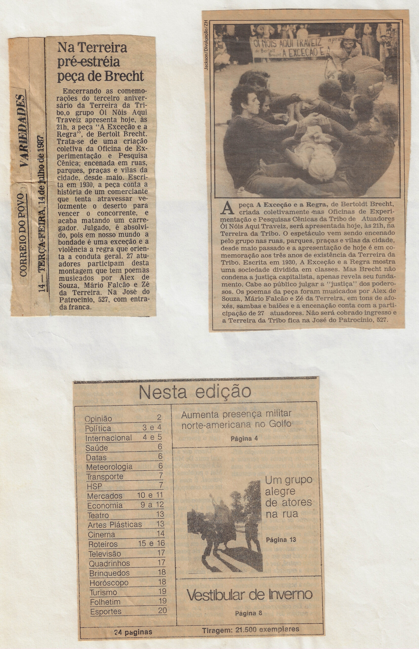 Três matérias. Primeira: Encerrando comemorações do terceiro aniversário da Terreira da Tribo grupo Ói Nóis Aqui Traveiz apresenta hoje às 21h peça 'A Exceção e a Regra' de Bertolt Brecht. Trata-se de criação coletiva da Oficina de Experimentação e Pesquisa Cênica encenada em ruas, parques, praças e vilas da cidade desde maio. Escrita em 1930 peça conta história de comerciante que tenta atravessar velozmente deserto para vencer concorrente acaba matando um carregador. Julgado e absolvido pois mundo a bondade é exceção e violência é regra. 27 atuadores participam desta montagem com poemas musicados por Alex de Souza, Mário Falcão e Zé da Terreira. Segunda: Índice de conteúdos do jornal. Terceira: Pequena nota sobre grupo alegre de atores na rua página 13 e 'Vestibular de Inverno' página 8.