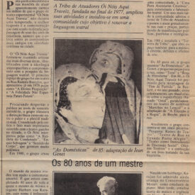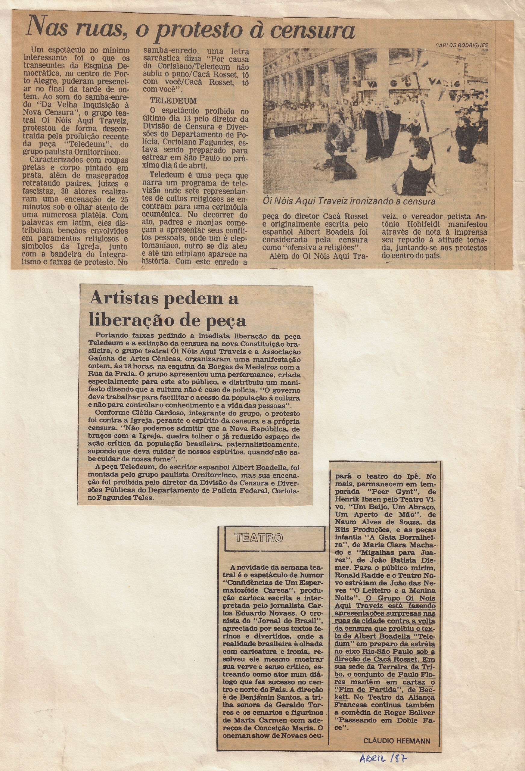 Duas matérias. Primeira: Espetáculo no mínimo interessante foi o que os transeuntes da Esquina Democrática no centro de Porto Alegre puderam presenciar ontem na tarde de ontem. Tribo de Atuadores Ói Nóis Aqui Traveiz protestou de forma descontraída pela proibição recente da peça Teledeum do grupo paulista Ornitorrinco. Caracterizados com roupas pretas e corpo pintado em praia além de mascarados retratando padres juízes e fascistas. Atores realizaram uma encenação de 25 minutos ao olhar atento de uma numerosa platéia. Com palavras em latim performance distribuíam bênçãos envolvidos em paramentos religiosos e símbolos da Igreja junto com bandeira do Integralismo e faixas de protesto. No espetáculo proibido no último dia 13 pelo diretor da Divisão de Censura e Diversões do Departamento de Polícia Coriolano Fagundes Teles estava sendo preparado para estrear em São Paulo no próximo dia 6 de abril. Teledeum é uma peça que narra um programa de televisão onde sete representantes de cultos religiosos se encontram para cerimônia ecumênica. Foto: Ói Nóis Aqui Traveiz ironizando a censura. Segunda matéria: repetição de conteúdo sobre liberação da peça com box mencionando próximas estreias para o teatro do Ipê. No mais permanecerão em temporada peças 'Peer Gynt' de Henrik Ibsen pelo Teatro Vísceras e shows de Francis Hime no Le Club.
