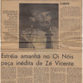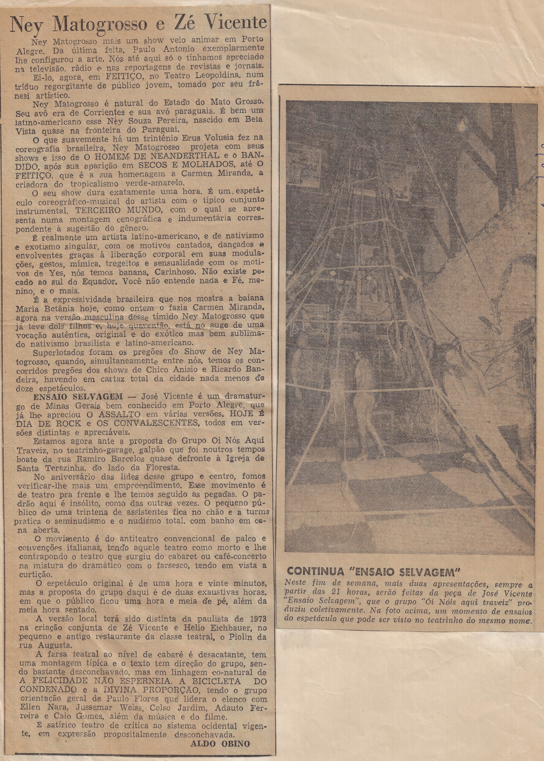 Ney Matogrosso mais um show veio animar em Porto Alegre. Da última feita, Paulo Antonio exemplarmente lhe configurou a arte. Nós até aqui só o tínhamos apreciado na televisão, rádio e nas reportagens de revistas e jornais. Ei-lo, agora, em FEITIÇO, no Teatro Leopoldina, num tríduo reorganizante de público jovem, tomado por seu frescor artístico. Ney Matogrosso é natural do Estado do Mato Grosso. Seu avô era já conhecido e sua avó paraguaia. E bem um latino-americano esse Ney Souza Pereira, nascido em Bela Vista quase na fronteira do Paraguai. O que sucedente no intrínio Erus Volusia fez na coreografia brasileira, Ney Matogrosso está fazendo com seus shows tais como HOMEM DE NEANDERTHAL e o BANDIDO, após sua aparição em SECOS E MOLHADOS, até O FEITIÇO, que é a sua homenagem a Carmen Miranda, a criadora do tropicalismo verde-amarelo. ENSAIO SELVAGEM — José Vicente é um dramaturgo de Minas Gerais bem conhecido em Porto Alegre, que já lhe apreciou O ASSALTO em várias versões, HOJE É DIA DE ROCK e OS CONVALESCENTES, todos em versões distintas e apreciáveis. Estamos agora vendo a proposta do Grupo Oi Nós Aqui Traveiz, no teatrinho-garage, galpão que foi noutros tempos boate no Ramiro Barcelos quase defronte à Igreja de Santa Terezinha, do lado da Floresta. A farsa teatral ao nível de cabaré é descatante, tem uma montagem típica e o texto tem direção do grupo, sendo bastante desconchavado, mas em linguagem co-natural de A FELICIDADE NÃO ESPERNEIA, A BICICLETA DO CONDENADO e a DIVINA PROPORÇÃO.