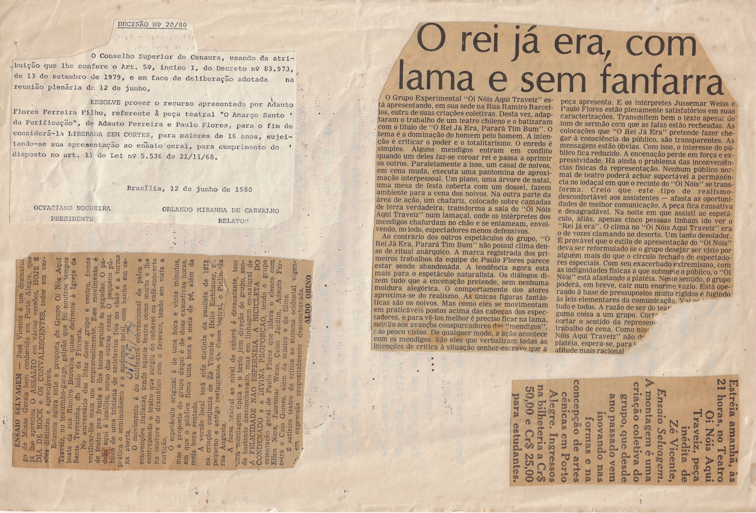 Crítica extensa do espetáculo "O Rei Já Era Parara TimBum Bum". Os intérpretes Jussemar Weiss e Paulo Flores estão plenamente satisfatórios em suas caracterizações. Transitem bem do texto apenas do sermão que as falas são poucas colocações que "O Rei Já Era" pretende fazer chegar à consciência do público são plenamente mensagens estão óbvias. Com isso o interesse do público fica retardado a emocionalmente perde em força e expressividade. Discussão sobre elementos de cena teatro experimental clima envolvimento do público. Análise da cenografia iluminação e proposta estética do grupo.