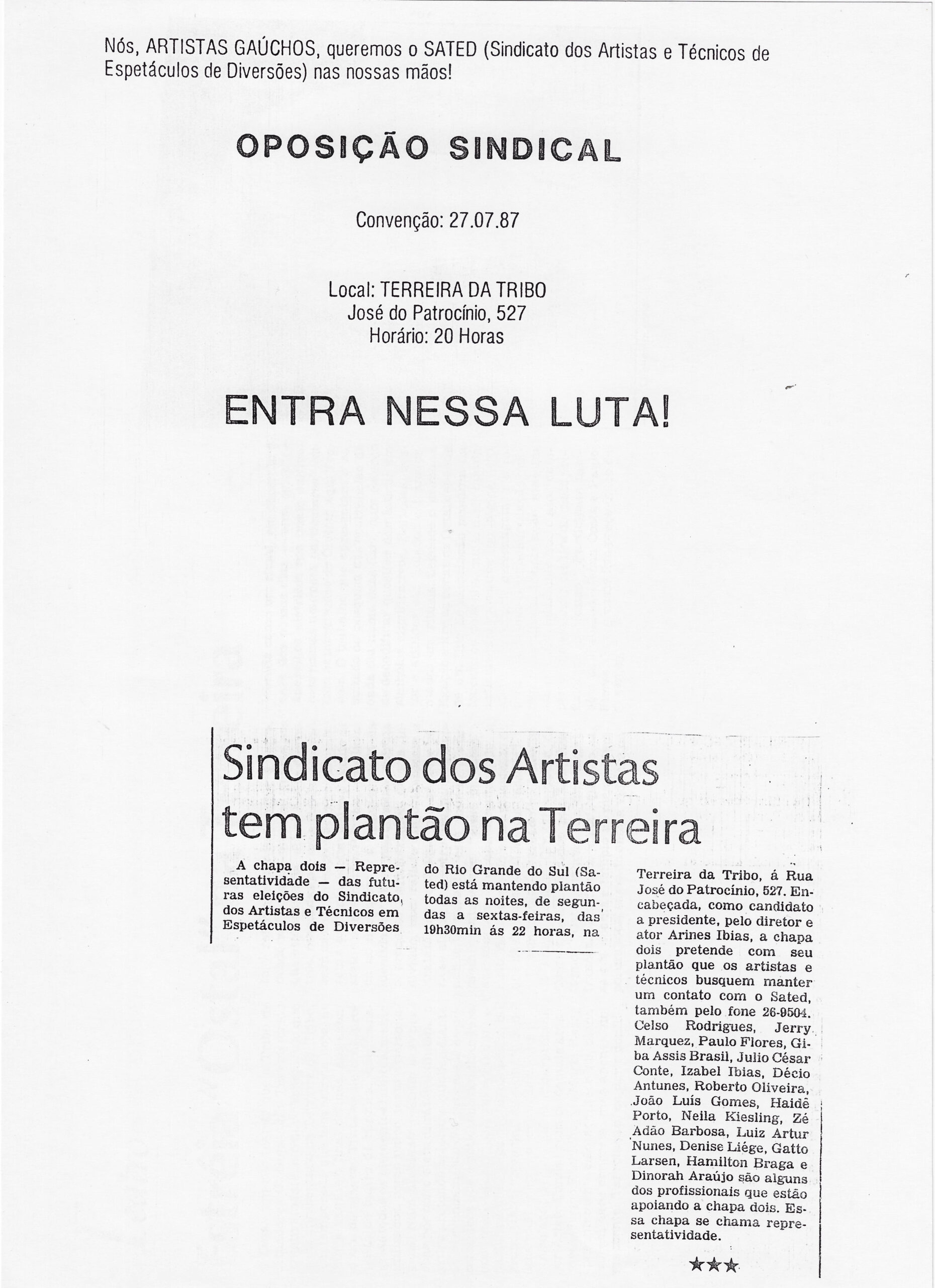 Nós, ARTISTAS GAÚCHOS, queremos o SATED (Sindicato dos Artistas e Técnicos de Espetáculos de Diversões) nas nossas mãos! OPOSIÇÃO SINDICAL. Convenção: 27.07.87. Local: TERREIRA DA TRIBO José do Patrocínio, 527 Horário: 20 Horas ENTRA NESSA LUTA! A chapa dois — Representatividade — das futuras eleições do Sindicato dos Artistas e Técnicos em Espetáculos de Diversões do Rio Grande do Sul (Sated) está mantendo plantão todas as noites, de segunda às sextas-feiras, das 19h30min às 22 horas, na Terreira da Tribo, à Rua José do Patrocínio, 527. Encabeçada, como candidato à presidente, pelo diretor e ator Arines Ibias, a chapa dois pretende com seu plantão que os artistas e técnicos busquem manter um contato com o Sated, também pelo fone 26-9504. Celso Rodrigues, Jerry Marquez, Paulo Flores, Giba Assis Brasil, Julio César Conte, Izabel Ibias, Décio Antunes, Roberto Oliveira, João Luis Gomes, Haide Porto, Neila Kiesling, Zé Adão Barbosa, Luiz Artur Nunes, Denise Liège, Gatto Larsen, Hamilton Braga e Dinorah Araujo são alguns dos profissionais que estão apoiando a chapa dois. Essa chapa se chama representatividade.