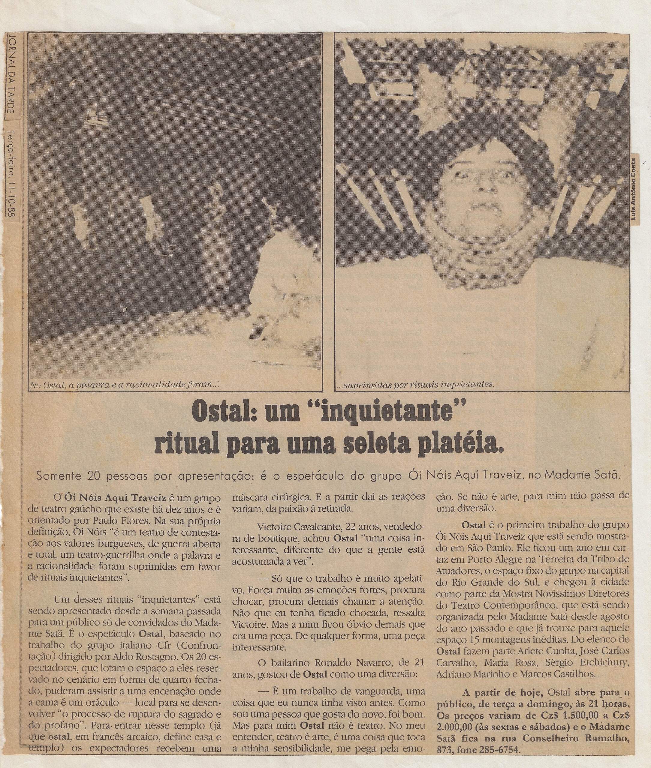 Ostal: um “inquietante” ritual para uma seleta platéia. Voltar AD.ONAT00228 Metadados Número de RegistroAD.ONAT.00228AutoriaJornal da TardeDescriçãoMatéria sobre a peça Ostal do grupo Ói Nóis Aqui Traveiz apresentada no Madame Satã. Menciona ritual inquietante e linguagem experimental.Data11/10/1988Local de ProduçãoAmérica do Sul > Brasil > São Paulo > São PauloDenominaçãoClipagemAtividadeCelebração > Teatro de Vivência > Ostal - Rito TeatralMaterialidadePapelEstado de ConservaçãoBomPalavras-chaveCrítica teatral; Performance REAÇÃO À MEDIOCRIDADE IV Festival de Teatro: sem atrativos Voltar para a lista de itens