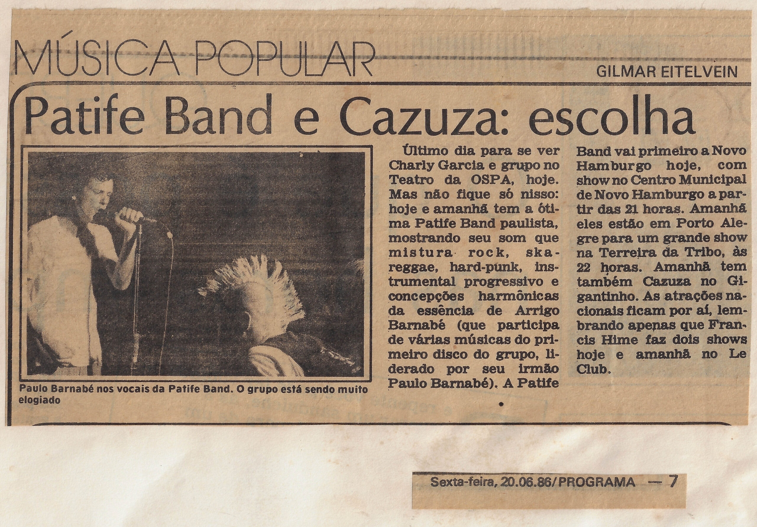 Este artigo apresenta as opções de shows de música popular disponíveis naquele final de semana. O destaque era o último dia para ver Charly Garcia e grupo no Teatro da OSPA. Para quem não quisesse ficar apenas nisso, havia a ótima Patife Band paulista mostrando seu som que mistura rock, ska-reggae, hard-punk, instrumental progressivo e concepções harmônicas da essência de Arrigo Barnabé, que participava de várias músicas do primeiro disco do grupo liderado por seu irmão Paulo Barnabé. O grupo estava sendo muito elogiado pela crítica.