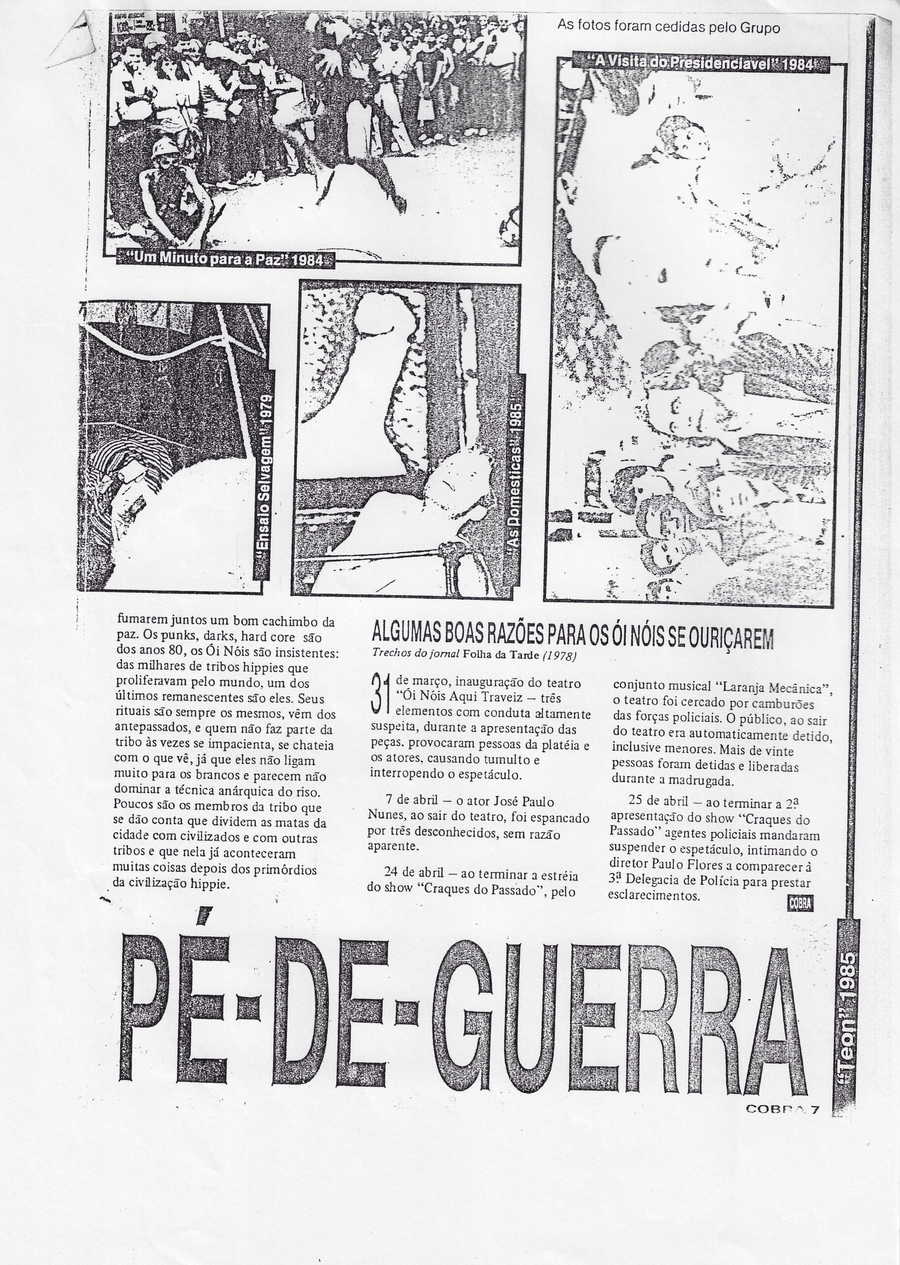 fumarem juntos um bom cachimbo da paz. Os punks, darks, hard core são dos anos 80, os Ói Nóis são insistentes: das milhares de tribos hippies que proliferaram pelo mundo, um dos últimos remanescentes são eles. Seus rituais são sempre os mesmos, vêm dos antepassados, e quem não faz parte da tribo às vezes se impacienta, se chateia com o que vê, já que eles não ligam muito para os brancos e parecem não dominar a técnica anárquica do riso. Poucos são os membros da tribo que se dão conta que dividem as matas da cidade com civilizados e com outras tribos e que nela já aconteceram muitas coisas depois dos primórdios da civilização hippie. ALGUMAS BOAS RAZÕES PARA OS ÓI NÓIS SE OURIÇAREM - Trechos do jornal Folha da Tarde (1978). 31 de março, inauguração do teatro "Ói Nóis Aqui Traveiz" - três elementos com conduta altamente suspeita, durante a apresentação das peças, provocaram pessoas da platéia e os atores, causando tumulto e interrompendo o espetáculo. 7 de abril — o ator José Paulo Nunes, ao sair do teatro, foi espancado por três desconhecidos, sem razão aparente. 24 de abril — ao terminar a estréia do show "Craques do Passado", pelo conjunto musical "Laranja Mecânica", o teatro foi cercado por camburões das forças policiais. O público, ao sair do teatro era automaticamente detido, inclusive menores. Mais de vinte pessoas foram detidas e liberadas durante a madrugada. 25 de abril — ao terminar a 2ª apresentação do show "Craques do Passado" agentes policiais mandaram suspender o espetáculo, intimidando o diretor Paulo Flores a comparecer á 3ª Delegacia de Polícia para prestar esclarecimentos.