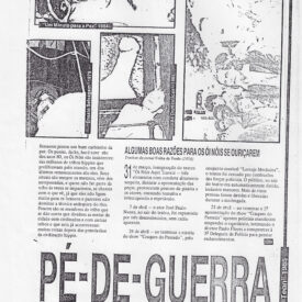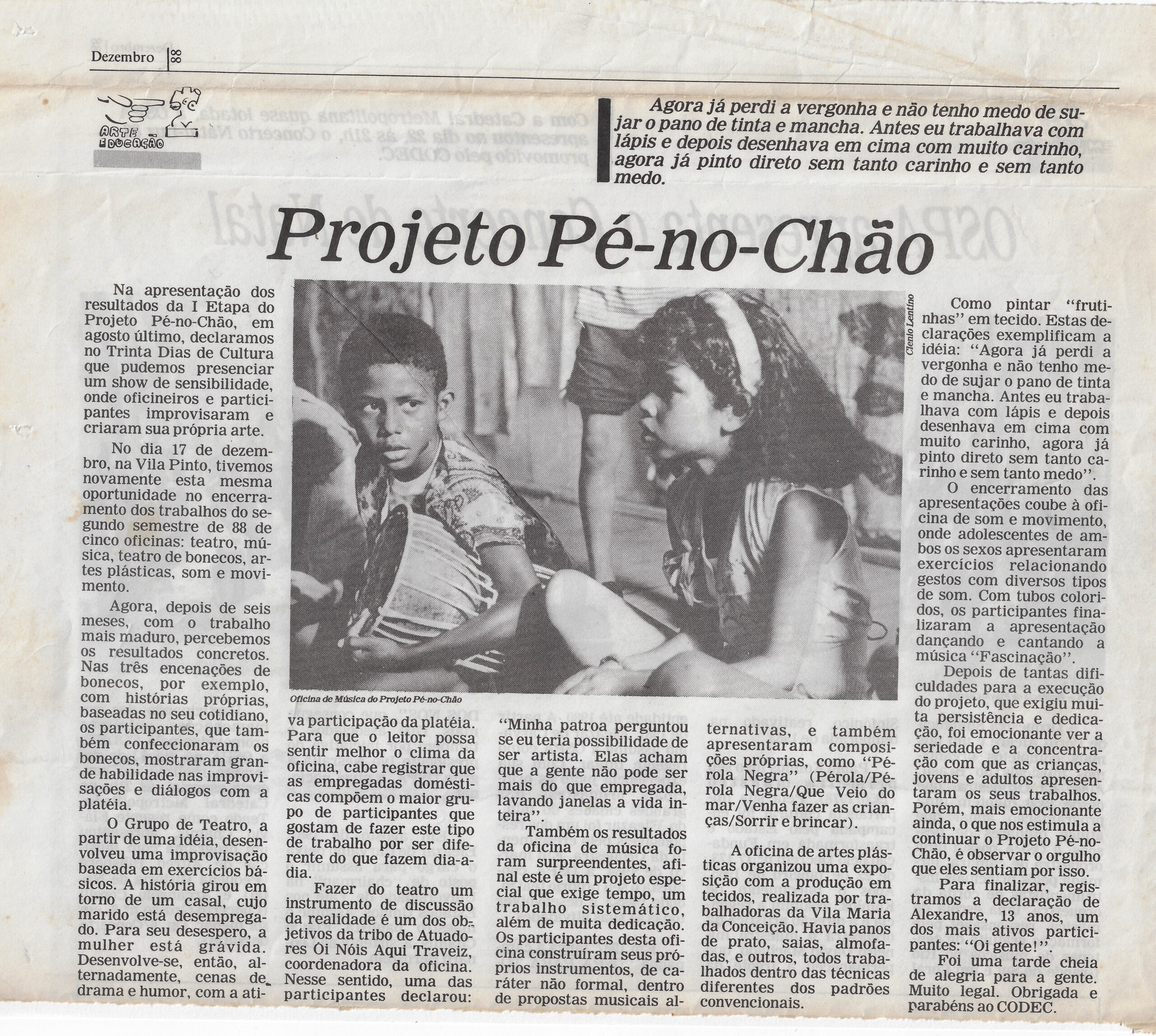 Na apresentação dos resultados da I Etapa do Projeto Pé-no-Chão, em agosto último, declaramos no Trinta Dias de Cultura que pudemos presenciar um show de sensibilidade, onde oficineiros e participantes improvisaram e criaram sua própria arte. No dia 17 de dezembro, na Vila Pinto, tivemos novamente esta mesma oportunidade no encerramento dos trabalhos do segundo semestre de 88 de cinco oficinas: teatro, música, teatro de bonecos, artes plásticas, som e movimento. Agora, depois de seis meses, com o trabalho mais maduro, percebemos os resultados concretos. Nas três encenações de bonecos, por exemplo, com histórias próprias, baseadas no seu cotidiano, os participantes, que também confeccionaram os bonecos, mostraram grande habilidade nas improvisações e diálogos com a platéia. O Grupo de Teatro, a partir de uma idéia, desenvolveu uma improvisação baseada em exercícios básicos. A história girou em torno de um casal, cujo marido está desempregado. Para seu desespero, a mulher está grávida. Desenvolve-se, então, alternadamente, cenas de drama e humor, com a ativação de uma idéia. Como pintar "frutinhas" em tecido. Estas declarações exemplificam a idéia: "Agora já perdi a vergonha e não tenho medo de sujar o pano de tinta e mancha. Antes eu trabalhava com lápis e depois desenhava em cima com muito carinho, agora já pinto direto sem tanto carinho e sem tanto medo."