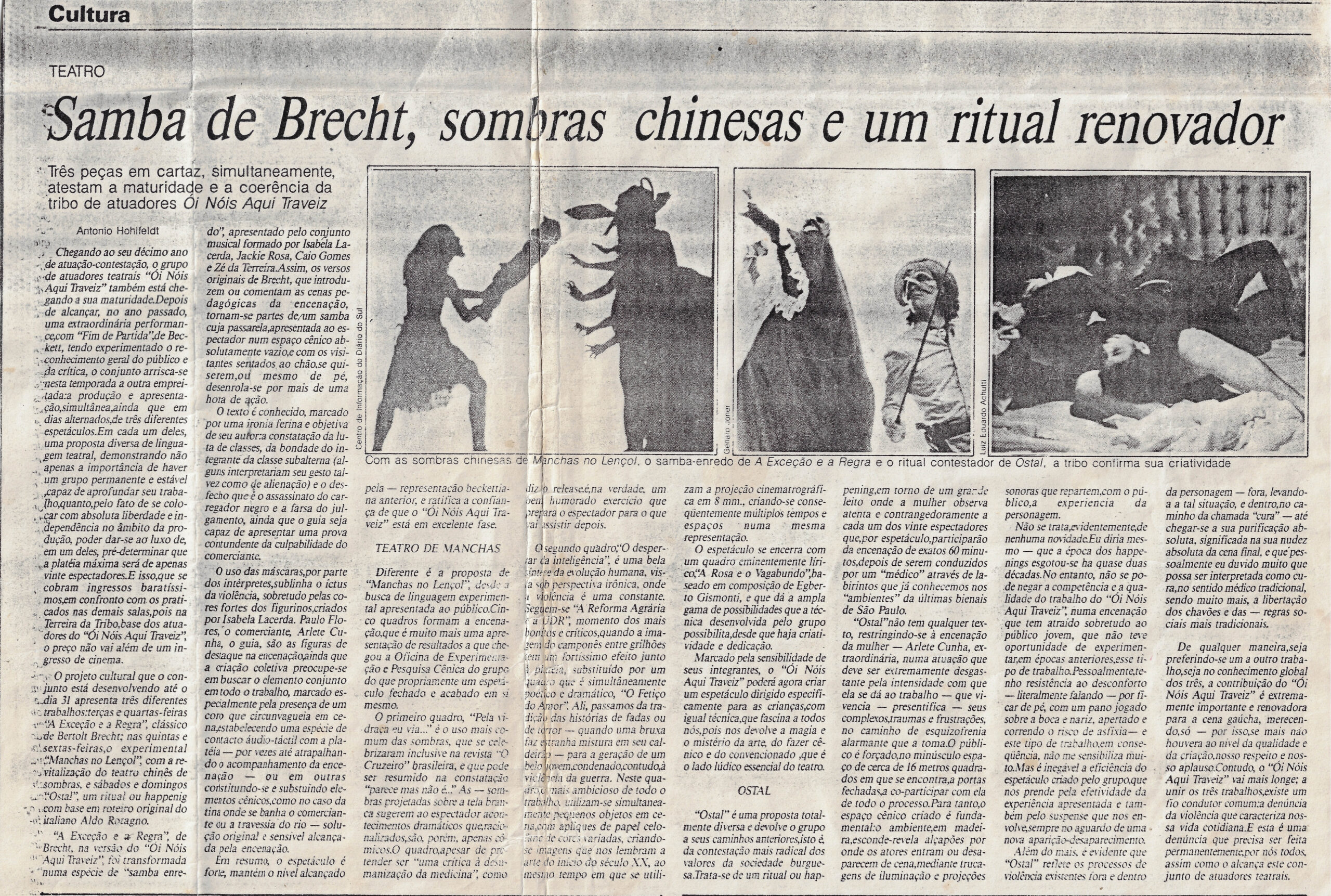 Três peças em cartaz, simultaneamente, atestam a maturidade e a coerência da tribo de atuadores Oi Nóis Aqui Traveiz. Chegando ao seu décimo ano de atuação-contestação, o grupo Terreira da Tribo de Atuadores Aqui Traveiz também está chegando à sua maturidade. Depois de alcançar, no ano passado, uma extraordinária reformulação Fim de Partida de Beckett. O conjunto atirra-se nesta temporada a outra empreitada a produção e apresentação simultânea ainda que em dias alternados de três diferentes espetáculos. Com as sombras chinesas de Manchas no Lençol, o samba estrada de A Exceção e a Regra e o ritual contestado de Ostal, a tribo confirma sua criatividade.