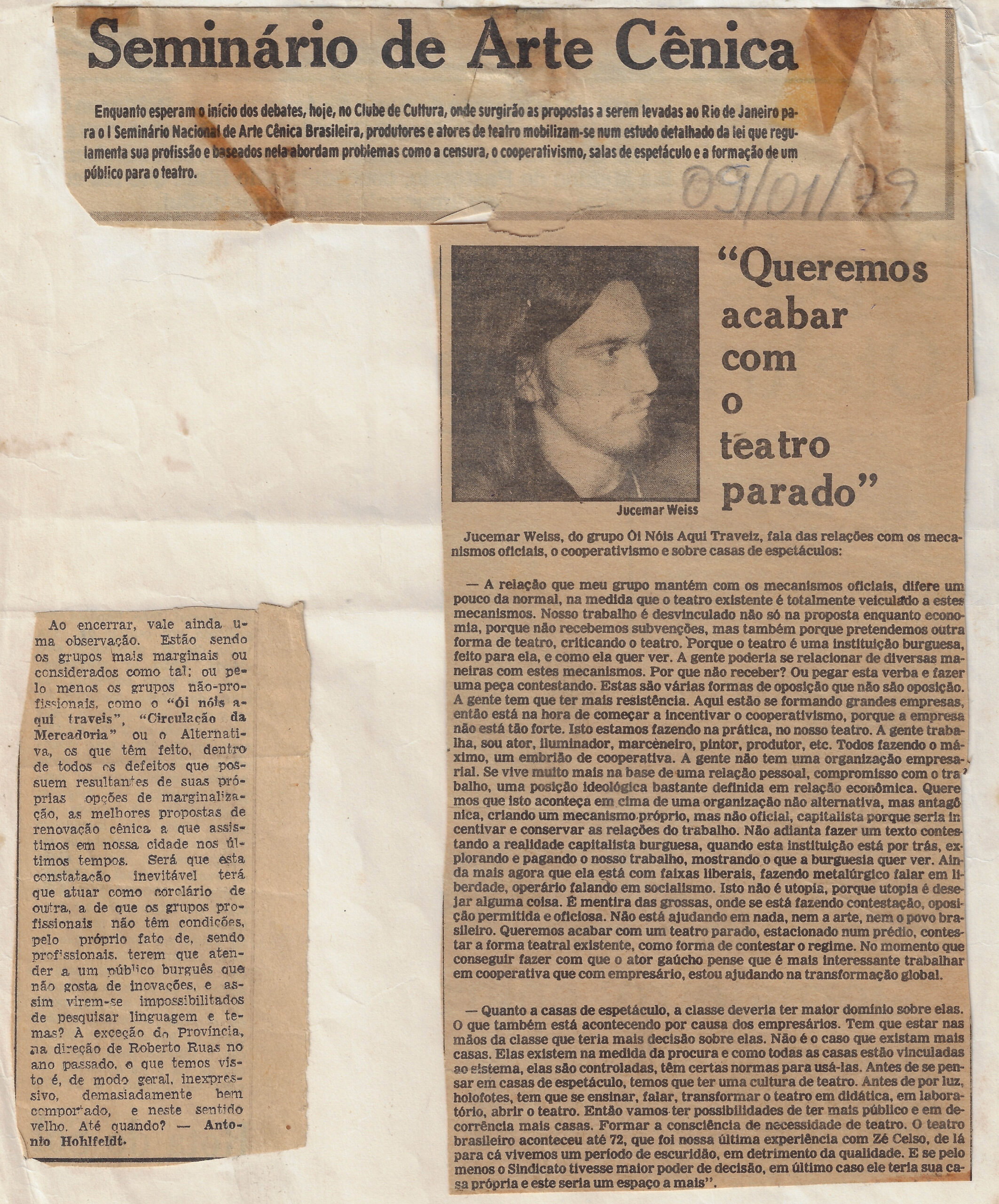 Enquanto esperam o início dos debates hoje no Clube de Cultura onde surgirão as propostas a serem levadas ao Rio de Janeiro para o I Seminário Nacional de Arte Cênica Brasileira produtores e atores de teatro mobilizam-se num estado detalhado da lei que regulamenta sua profissão e obcecados nelabordam problemas como a censura o cooperativismo salas de espetáculo e a formação de um público para o teatro. Ao encerrar vale ainda uma observação. Esta sendo os grupos mais marginais ou pelo menos os grupos fiéis considerados como tal ou pelo menos os grupos acerca fiéis como o "Ói nóis aqui traveiz" "Criatura" da Mercatoria ou o Alternativa os que feliz o deixam de todos os defeitos que possam resultar de suas próprias opções de manutenção execução as melhores propostas de renovação cênica e ou assistimos em nossa cidade nos últimos tempos. Será que não constatá-lo inevitável terá que algum como ocorria até outra de que os grupos profissionais não têm condições pelo próprio fato de profissionais terem que atender a um público burgês num não gosta de inovações e assim viriam em certa impossibilidade de pesquisar linguagem e formas? A exceção da tentativa da direção de Roberto Ruas no ano passado o que temos visto é de modo geral inexpressivo decididamente bem comportado muito neste sentido? Até quando? Antonio Hohlfeldt. Jucemar Weiss do grupo Oi Nóis Aqui Traveiz fala das relações com os mecanismos oficiais o cooperativismo e sobre casas de espetáculos.