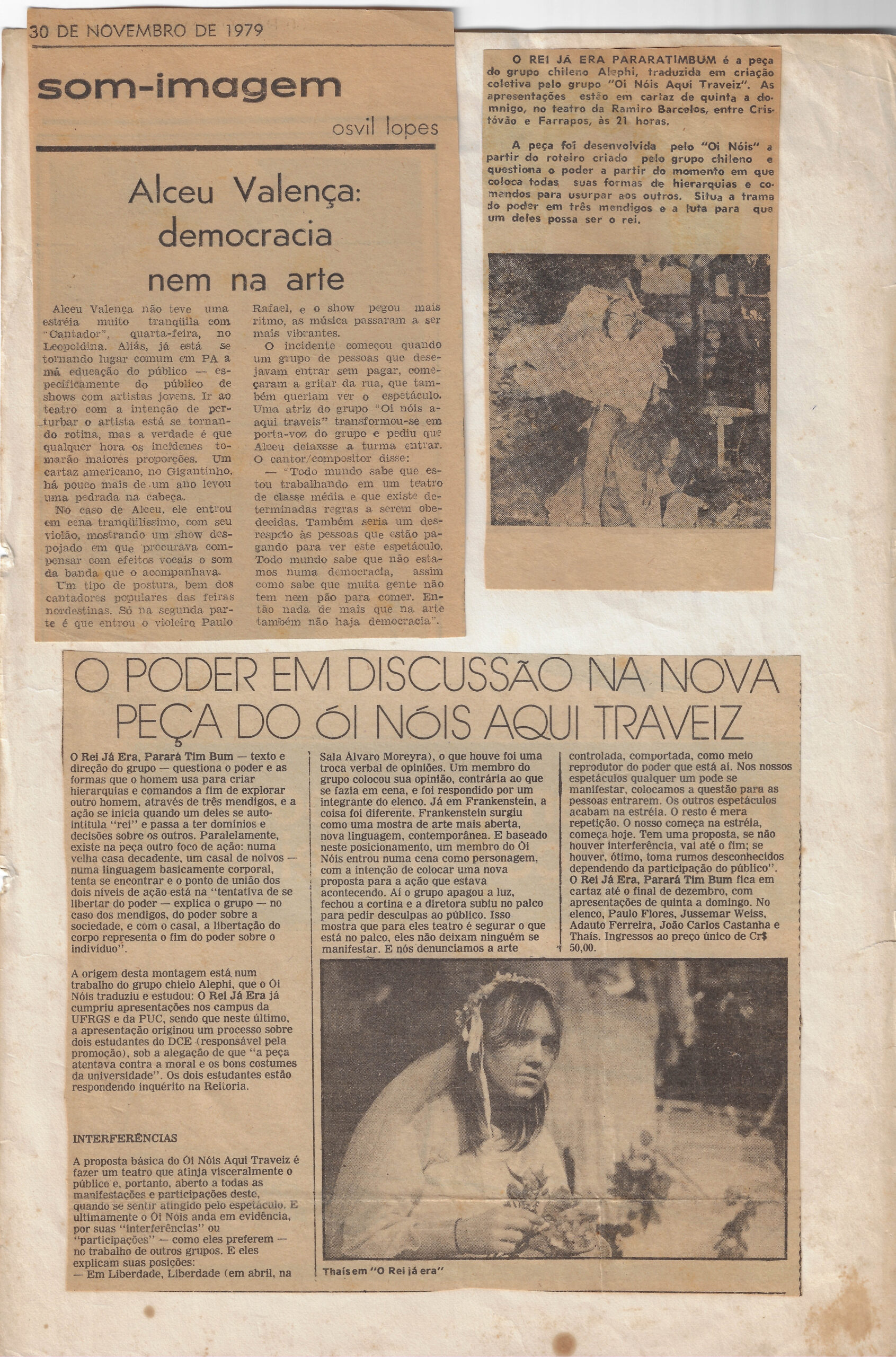 Esta nota anuncia a peça "O Rei Já Era Pararratimbum" do grupo chileno Aleph, traduzida em criação coletiva pelo grupo Ói Nóis Aqui Traveiz. As apresentações aconteciam de quinta a domingo no teatro da Ramiro Barcelos, entre Cristo Redentor e Farrapos, às 21 horas. A peça questiona o poder a partir do momento em que as pessoas são colocadas em formas de hierarquias e comandos. A trama situa o poder em três mendigos e sua luta para que um deles possa ser o rei.
