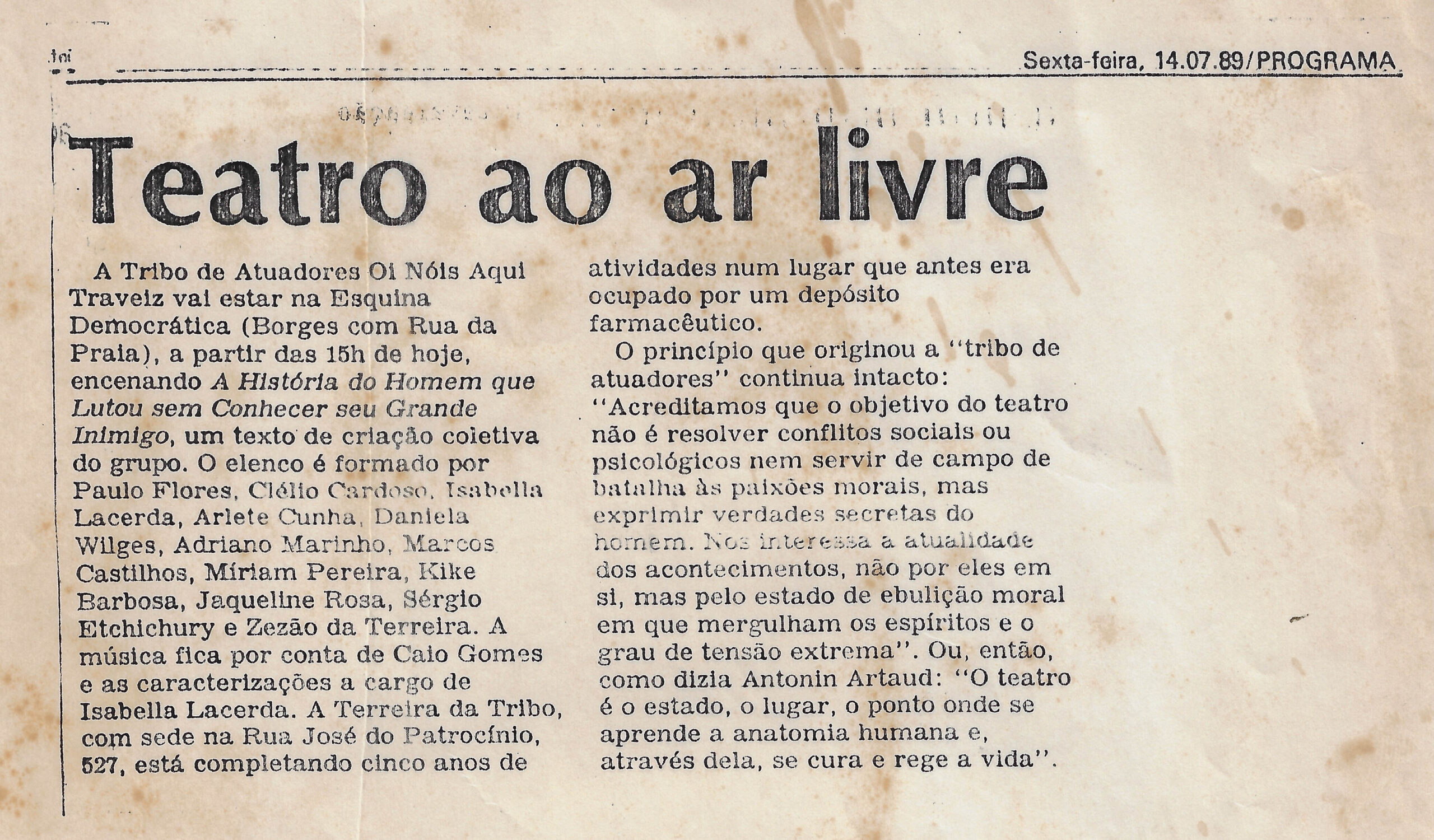 A Tribo de Atuadores Ói Nóis Aqui Traveiz vai estar na Esquina Democrática (Borges com Rua da Praia), a partir das 15h de hoje, encenando A História do Homem que Lutou sem Conhecer seu Grande Inimigo, um texto de criação coletiva do grupo. O elenco é formado por Paulo Flores, Clólio Cardoso, Isabella Lacerda, Arlete Cunha, Daniela Wilges, Adriano Marinho, Marcos Castilhos, Miriam Pereira, Kike Barbosa, Jaqueline Rosa, Sérgio Etchichury e Zezão da Terreira.