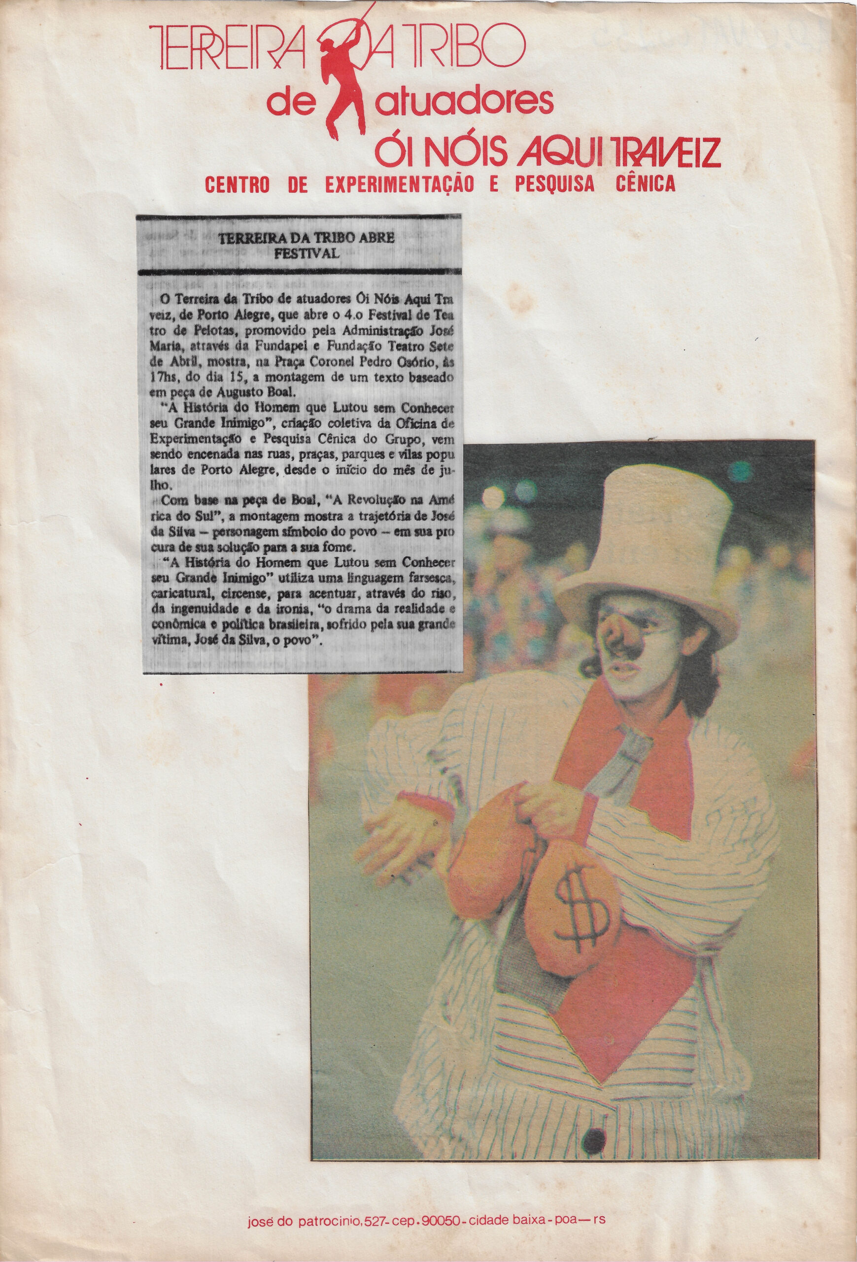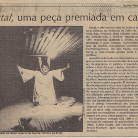 TERREIRA DA TRIBO ABRE FESTIVAL Voltar AD.ONAT00235 Metadados Número de RegistroAD.ONAT.00235AutoriaNão identificadoDescriçãoMaterial de divulgação da Terreira da Tribo com clipagem sobre 4.o Festival de Teatro de Pelotas. Menciona montagem A História do Homem que Lutou sem Conhecer seu Grande Inimigo.DataNão identificadoLocal de ProduçãoAmérica do Sul > Brasil > Rio Grande do Sul > PelotasAtividadeCelebração > Teatro de Rua > A História do Homem que Lutou Sem Conhecer Seu Grande InimigoMaterialidadePapelEstado de ConservaçãoBomPalavras-chaveFestival; Divulgação A Festa das Artes no Museu Ostal, uma peça premiada em cartaz Voltar para a lista de itens