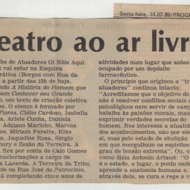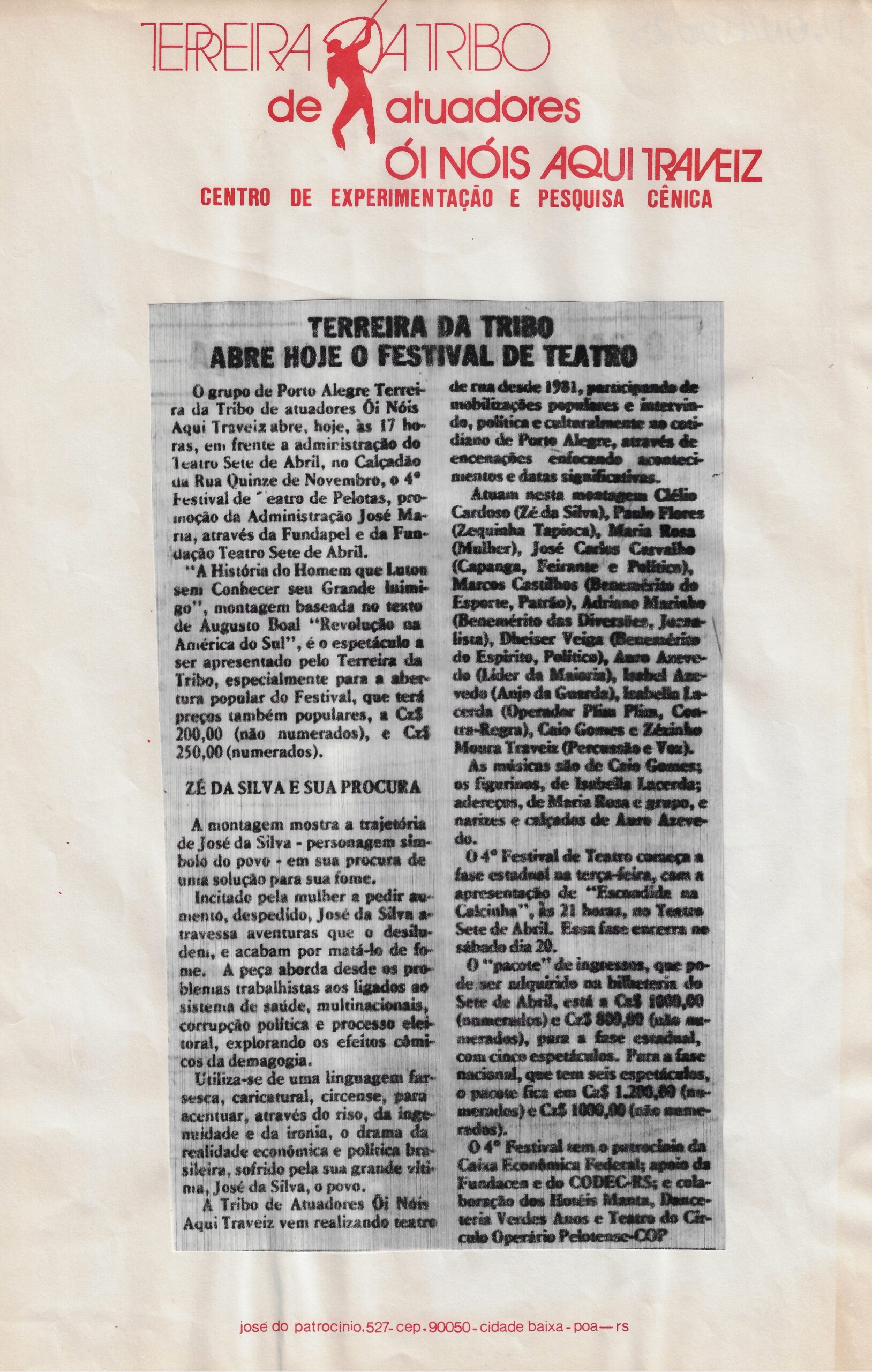 Grupo de Porto Alegre Terreira da Tribo de atuadores Ói Nóis Aqui Traveiz abre hoje às 17 horas em frente à administração do Teatro Sete de Abril no Calçadão da Rua Quinze de Novembro o 4º Festival de teatro de Pelotas promoção da Administração José Maria através da Fundapel e da Fundação Teatro Sete de Abril. 'A História do Homem que Lutou sem Conhecer seu Grande Inimigo' montagem baseada no texto de Augusto Boal 'Revolução na América do Sul' é o espetáculo a ser apresentado pelo Terreira da Tribo especialmente para abertura popular do Festival que terá preços também populares a Cz$ 200,00 (não numerados) e Cz$ 250,00 (numerados). Zé da Silva e sua procura. Montagem mostra trajetória de José da Silva personagem símbolo do povo em sua procura de uma solução para sua fome. Incitado pela mulher a pedir aumento despedido José da Silva atravessa aventuras que desiludem e acabam por matá-lo de fome. Peça aborda desde os problemas trabalhistas aos ligados ao sistema de saúde multinacionais corrupção política e processo eleitoral explorando efeitos cômicos da demagogia. Atuam na montagem Clélio Cardoso (Zé da Silva), Paulo Flores (Zequinha Tapioca), Maria Rosa (Mulher), José Carlos Carvalho (Capanga, Feirante e Político), Marcos Castilhos (Benemérito do Esporte, Patrão), Adriano Marinho (Benemérito das Diversões, Jornalista), Dheiser Veiga (Benemérito do Espírito, Político), Auro Azevedo (Líder da Maioria), Isabel Azevedo (Anjo da Guarda), Isabella Lacerda (Operador Plim Plim, Contra-Regra), Caio Gomes e Zézinho Moura Traveiz (Percussão e Voz). Músicas são de Caio Gomes os figurinos de Isabella Lacerda adereços de Maria Rosa e grupo narizes e calçados de Auro Azevedo.