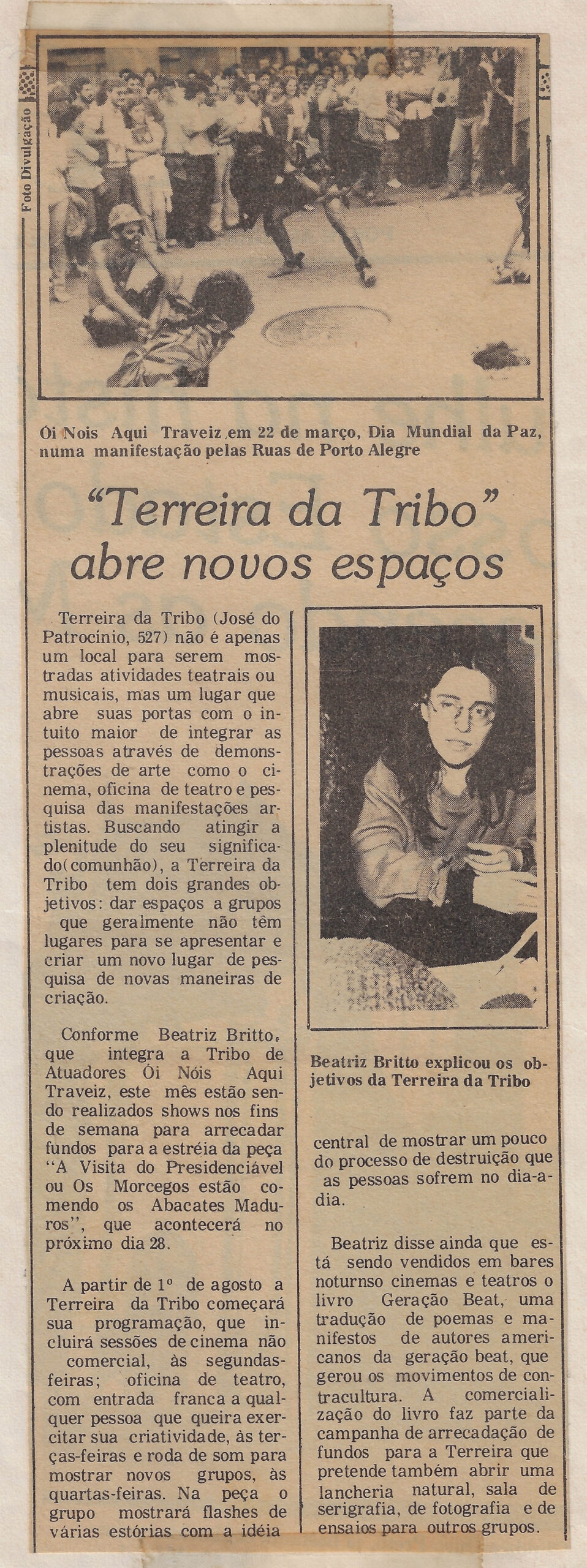 Terreira da Tribo (José do Patrocínio, 527) não é apenas um local para serem mostradas atividades teatrais ou musicais, mas um lugar que abre suas portas com o intuito maior de integrar as pessoas através de demonstrações de arte como o cinema, oficina de teatro e pesquisa das manifestações artísticas. Buscando atingir a plenitude do seu significado(comunhão), a Terreira da Tribo tem dois grandes objetivos: dar espaços a grupos que geralmente não têm lugares para se apresentar e criar um novo lugar de pesquisa de novas maneiras de criação. Conforme Beatriz Britto, integrante a Tribo de Atuadores Ói Nóis Aqui Traveiz, este mês estão sendo realizados shows nos fins de semana para arrecadar fundos para a estréia da peça "A Visita do Presidenciável" ou Os Morcegos estão comendo os Abacates Maduros", que acontecerá no próximo dia 28. A partir de 1º de agosto a Terreira da Tribo começará sua programação, que incluirá sessões de cinema não comercial, às segundas-feiras; oficina de teatro, com entrada franca a qualquer pessoa que queira experimentar sua criatividade, às terças-feiras e roda de som para investigar novos grupos, às quartas-feiras. Na peça o grupo mostrará flashes de várias estórias com conteúdo político/social que reflita um pouco do processo de destruição que as pessoas sofrem no dia-a-dia. Beatriz disse ainda que está sendo vendidos em bares noturnos circulares e livros de autores americanos da geração beat, uma tradução de poemas e manifestos de autores americanos da geração beat, que gerou os movimentos de contracultura. A edição do livro faz parte da campanha de arrecadação de fundos para a Terreira que pretende também abrir uma lancheria natural, sala de serigrafia, de fotografia e de ensaios para outros grupos.