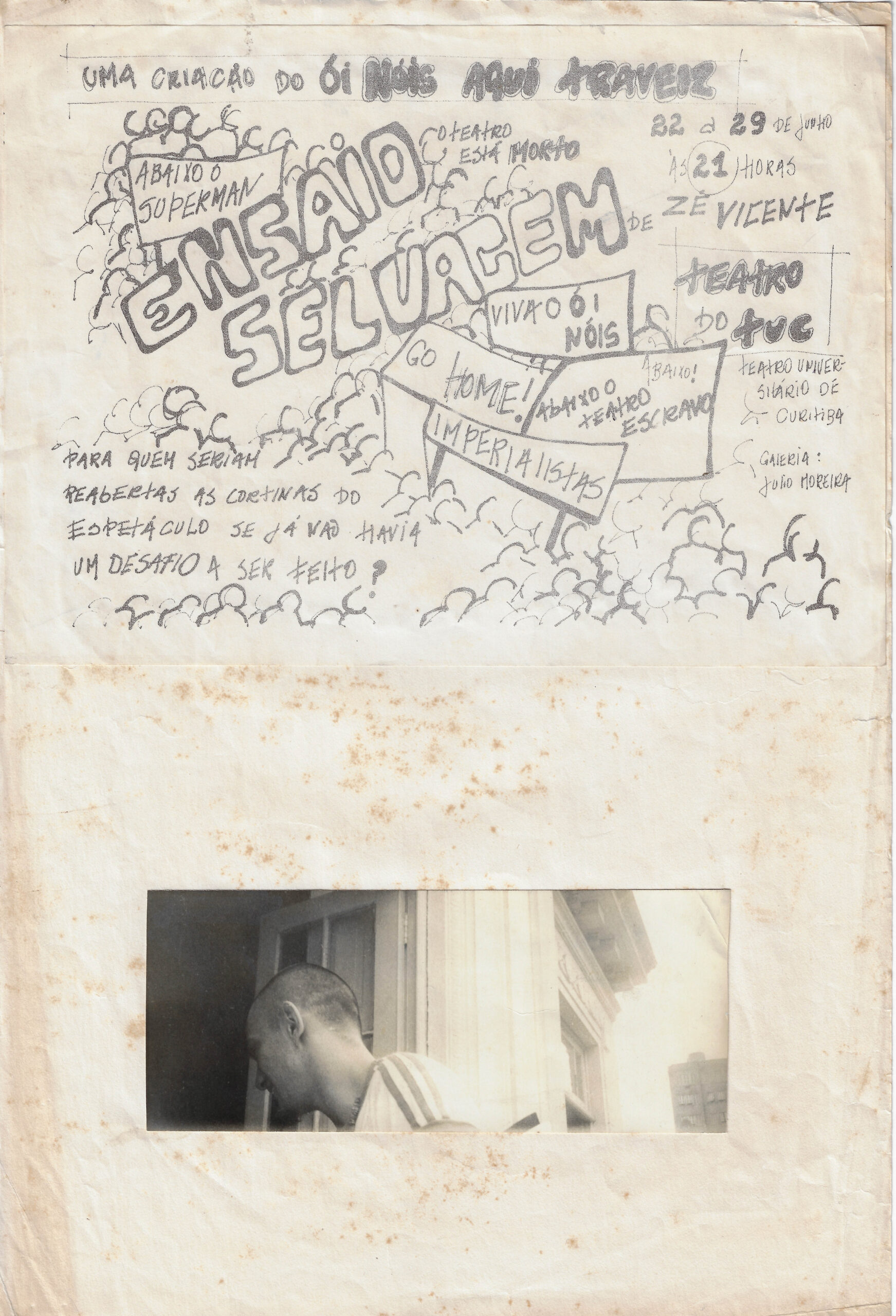 Cartaz/desenho manuscrito divulgando apresentação de "ENSAIO SELVAGEM" de Zé Vicente. Criação coletiva. Texto visível: "UMA CRIAÇÃO DO ÓI NÓIS AQUI TRAVEIZ / CQR / ENSAIO SELVAGEM / COM TEATRO SELVAGEM / O TEATRO DO RUA / VIVÃO ÓI NÓIS / VIVÃO O FOME BANANA ESCURO IMPERIALISTAS / ZÉ VICENTE / TEATRO / TEATRO UNIVERS SIDÔNIO DE CUCURIZBA / GABOIA: JOÃO FREITAS / 28 a 29 de junho às 21 HORAS / PARA QUEM SENTIR REALERDAS AS CORTINAS DO ESPETÁCULO SE JÁ VÃO HAVIA UM DESAFIO A SER FEITO?"