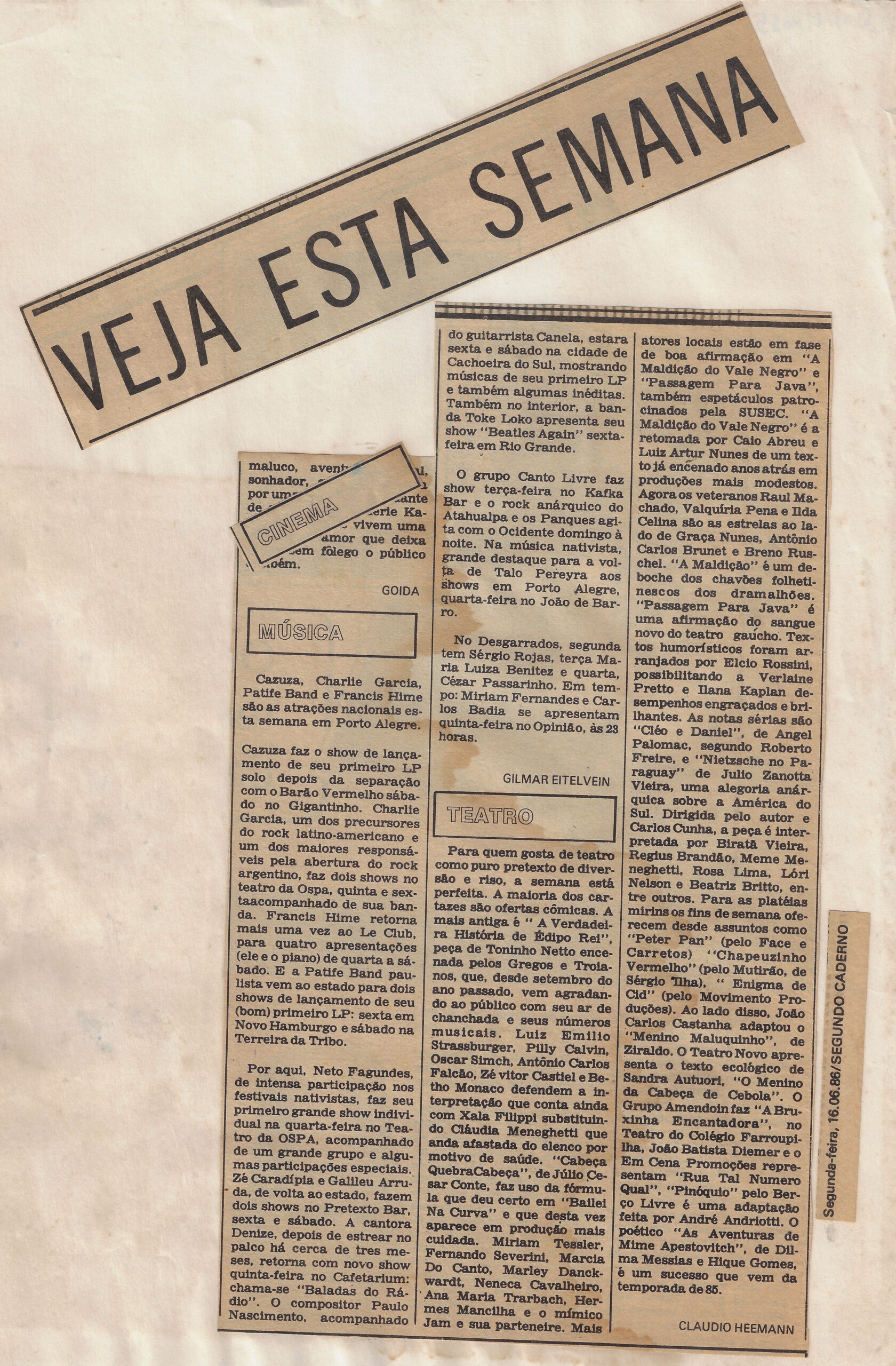 TEATRO: A VISITA DO PRESIDENCIÁVEL - Na Terreira da Tribo (José do Patrocínio, 527), às 21h, a criação coletiva do grupo Oi Nóis Aqui Traveiz, formada por uma colagem de textos do autor português Luís Francisco Rebello. Uma mistura de teatro do absurdo, sessão de rock, cinema underground, poesia marginal e vanguarda plástica. Ingressos a Cr$ 2.500, no local.