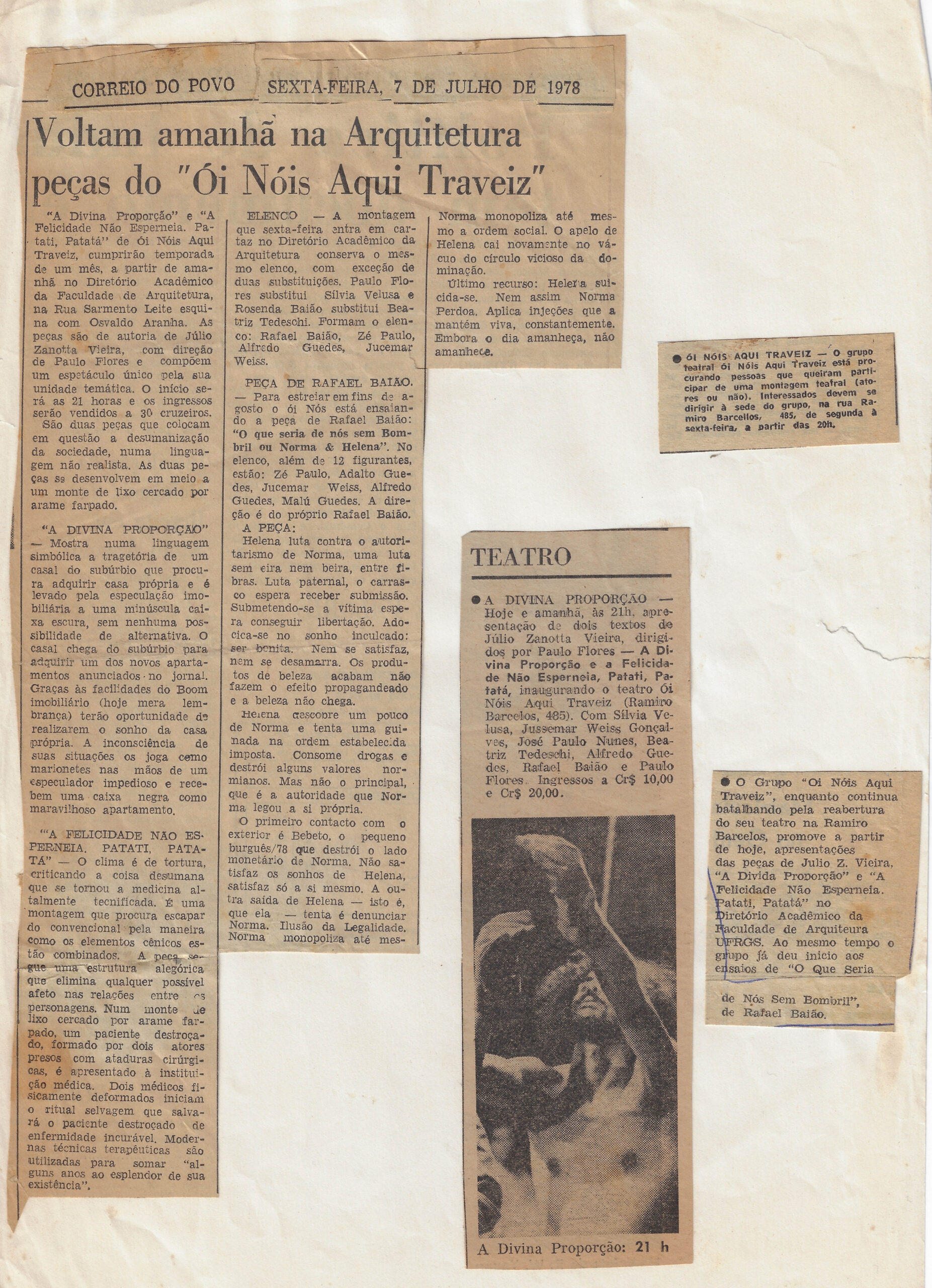O grupo Ói Nóis Aqui Traveiz cumpre temporada de um mês a partir de amanhã no Diretório Acadêmico da Faculdade de Arquitetura. A programação apresenta duas peças: "A Divina Proporção" e "A Felicidade Não Esperncia. Patatá", ambas com direção de Paulo Flores. A primeira peça, de autoria de Júlio Zanotta Vieira, estreou em 1976 e apresenta espetáculo único sobre a unidade temática com ingressos vendidos antecipadamente às 21h. "A Felicidade Não Esperncia. Patatá" trata de especulação imobiliária através de linguagem teatral que desenvolve técnica inspirada no Boom Econômico, questionando a desumanização da sociedade numa linguagem não realista. As peças colocam em cena monte de lixo cercado por arame farpado como cenário metafórico da condição humana sob opressão. São duas peças que refletem o compromisso do grupo com teatro político e experimental.