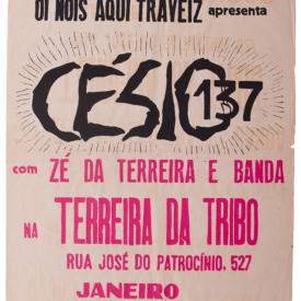 O cartaz de fundo branco apresenta na extremidade superior, em letra de forma, a inscrição "Tribo de Atuadores - Oí Noís Aqui Traveiz apresenta". Ocupando a maior parte da metade superior do cartaz a inscrição "Fim de Partida" também em letra de forma. Logo abaixo, a inscrição "de SAMUEL BECKETT” em letra de forma. Logo abaixo a inscrição "A peça mais premiada da temporada - Prêmio Assorianos de Melhor Atriz Especial - Melhor Atôr - Melhor Atôr Coadjuvante Melhor Cenografia - Melhor Figurino". Em letra de forma a frase "Teatro Ferreira da Tribo" ocupa maior parte da metade inferior do cartaz. Ainda em letra de forma, as inscrições "Rua José do Patrocínio, 527 sextas a domingos - 21hs.". Todas as inscrições do cartaz apresentam um padrão de cor degradê em vermelho e preto. O vermelho parte da esquerda e vai esmaecendo até o centro do cartaz, onde se mistura com o preto também esmaecido, que vai se tornando mais intenso até a extremidade direita do cartaz.