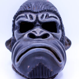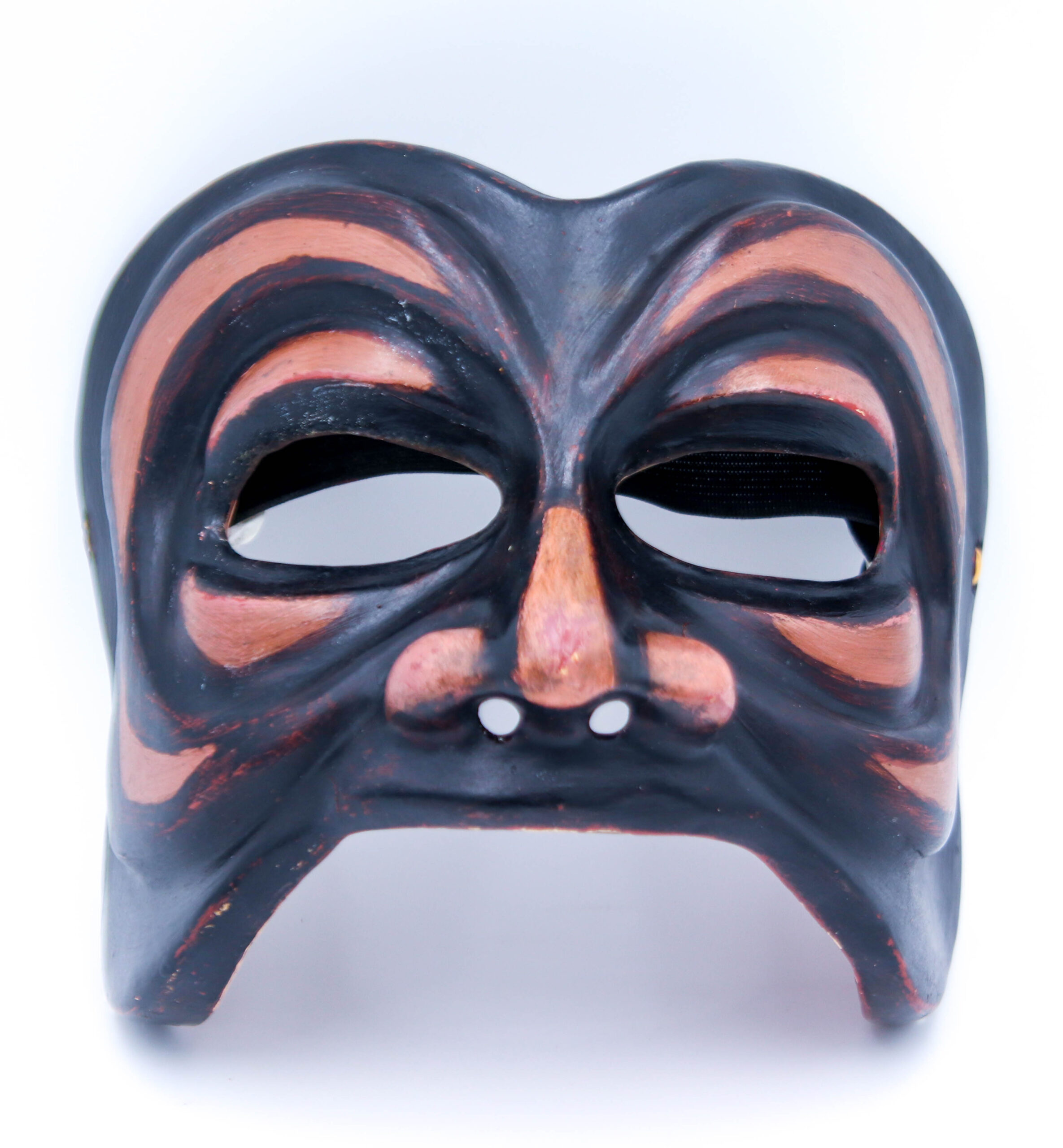 Máscara teatral confeccionada em resina e fibra, apresentando pintura em duas cores predominantes: preto e terracota dispostas em faixas alternadas que percorrem organicamente toda a superfície. A peça possui grandes aberturas oculares ovais delimitadas por espessas molduras em relevo, nariz proeminente e largo com narinas perfuradas visíveis, e ampla abertura bucal circular com lábios grossos e salientes, sendo o inferior mais pronunciado. O padrão cromático segue ritmicamente a anatomia facial, acentuando volumes e contornos, criando uma expressão dramática característica. A máscara apresenta sinais de desgaste e uso, com áreas de descamação da pintura e pequenas imperfeições que conferem pátina à peça.